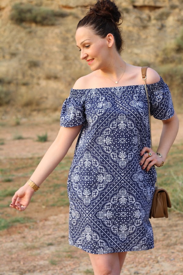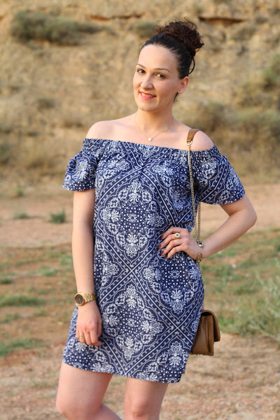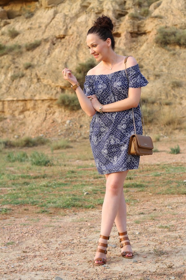 A principios de verano me compré este vestido off the shoulders y aunque lo he llevado bastante por aquí todavía no había aparecido. Tiene una tela con un dibujo que me encanta y la verdad es que es muy cómodo. Hoy lo he combinado con complementos en tonos camel, este combo de colores siempre me ha gustado. Muchas gracias por vuestras visitas y comentarios.