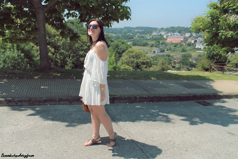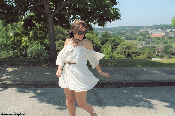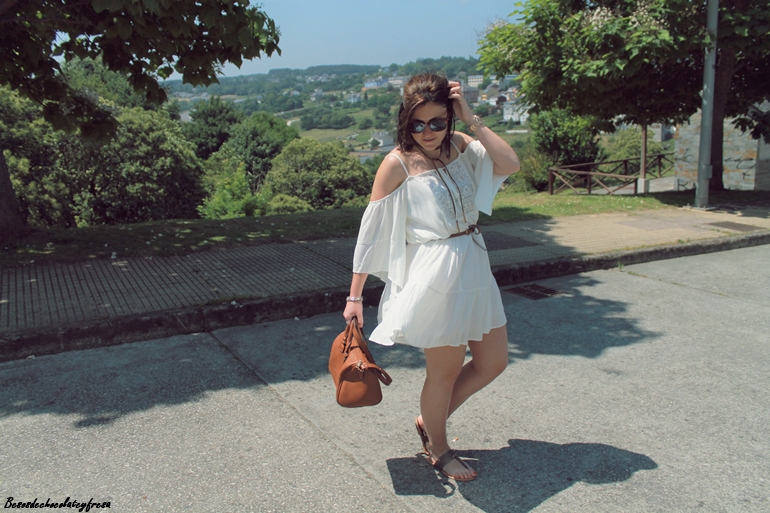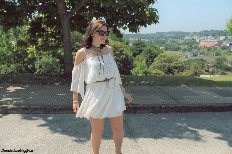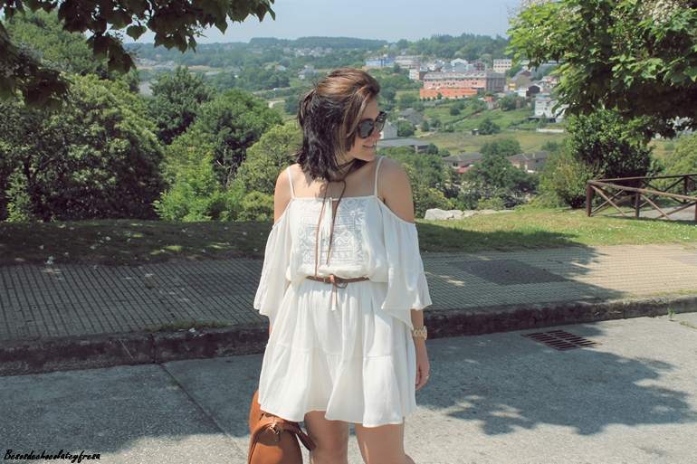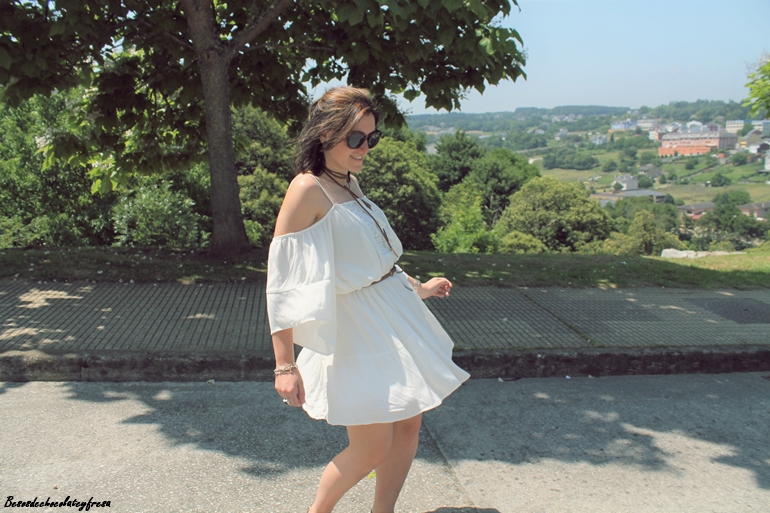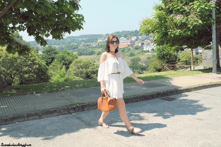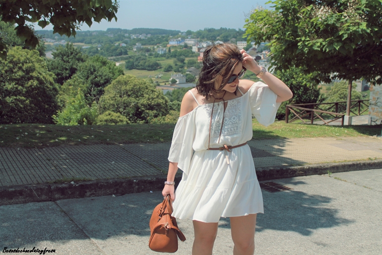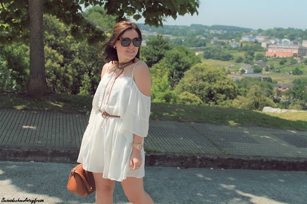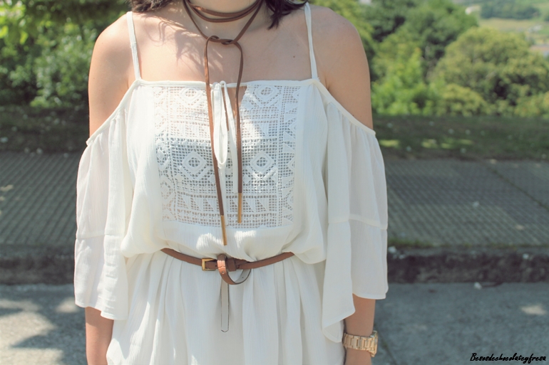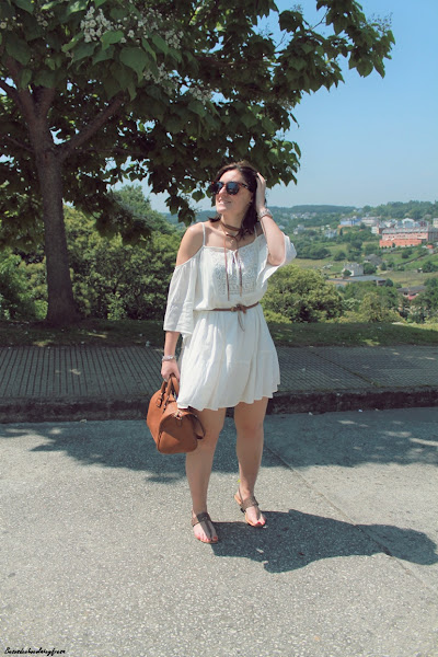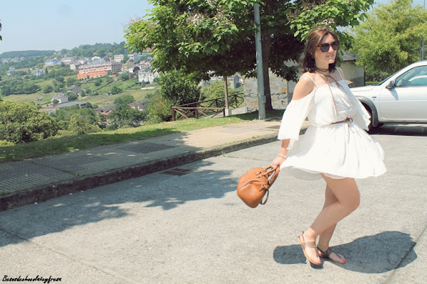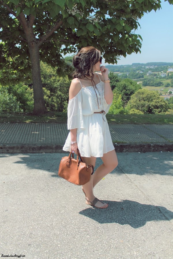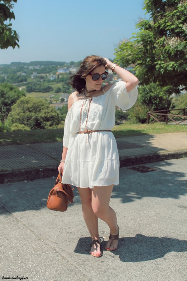 Preparadas ya para la ola de calor, en esta ocasión opté por un vestido muy muy fresquito con tendencia cut out (tirante spaguetti y manguita dejando descubiertos los hombros). Lo combiné con complementos en marrón para que resaltasen frente al blanco como son un cinturón para marcar la cintura, sandalias, bolso tote y choker.