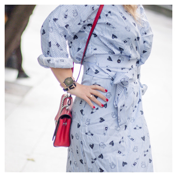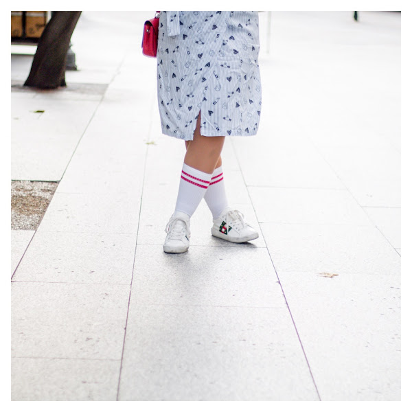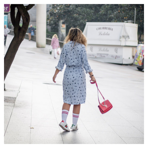 Se trata de un vestido súper cómodo y con una tela súper suave con estampado de rayas azules y blancas y pequeños dibujos en negro. Lo he combinado con unos calcetines de inspiración deportiva de Pull&Bear de nueva temporada y estas deportivas tan originales de Gucci. El bolso rojo es de Louis Vuitton.