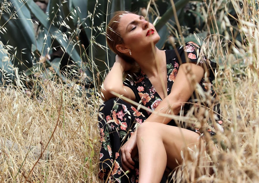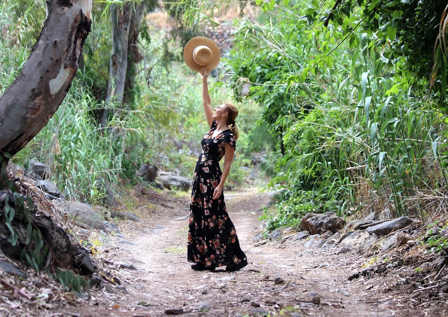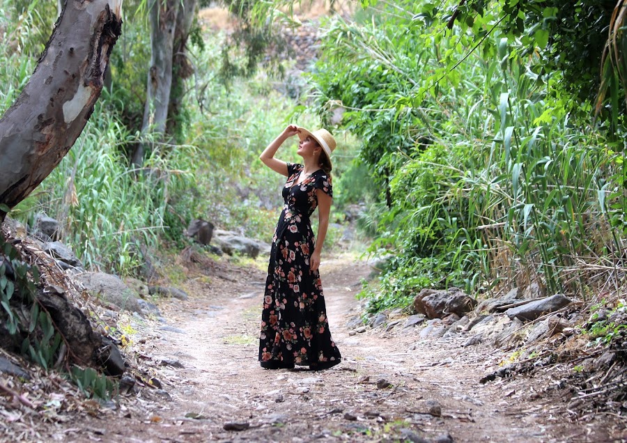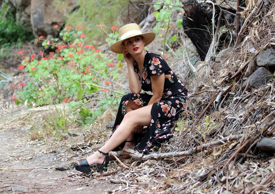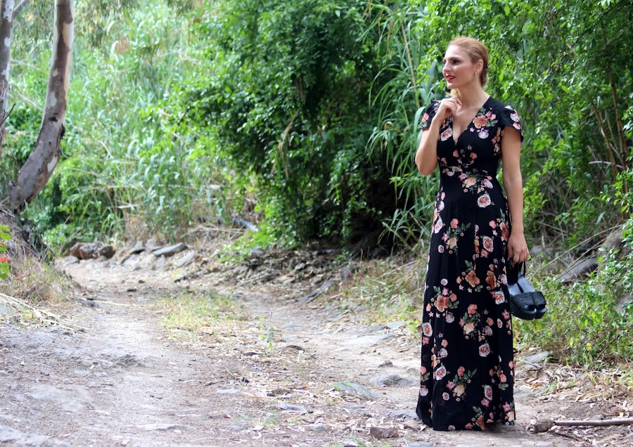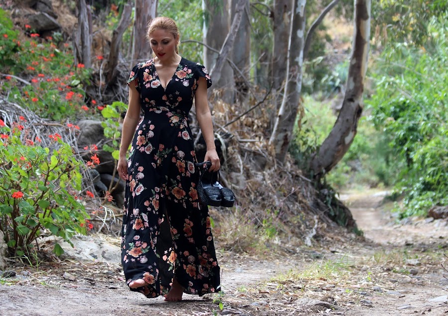 Las reinterpretaciones del estampado se cuentan por cientos y la gama de colores y vocaciones es tan grande que tiende al infinito. En el look que nos ocupa hoy el vestido tiene unas flores románticas de tamaño medio con un fondo negro.