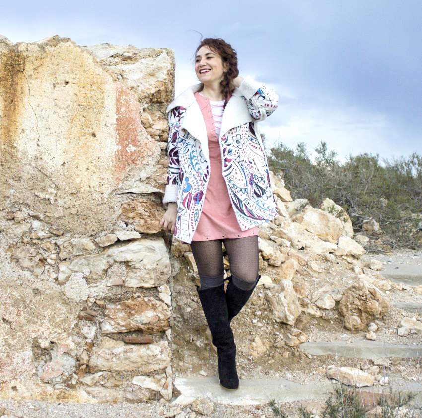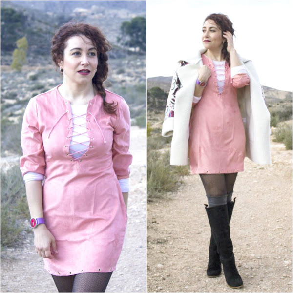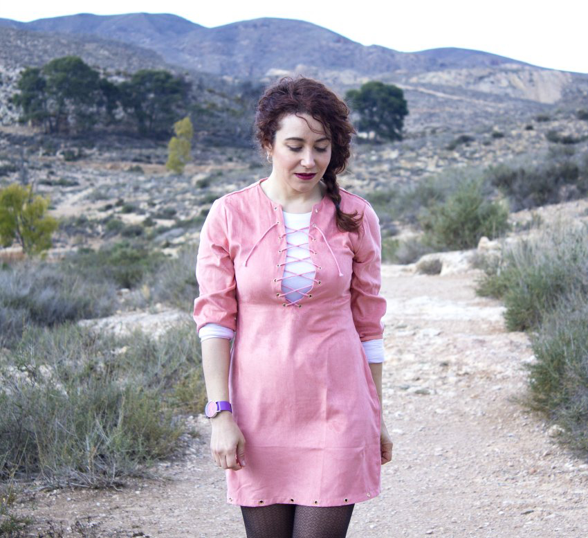 Moreover, pink color has always been a challenge for me, since it has never been my favorite color, but I loved this lacing neckline dress (here). For the finishing touch, a high socks and cowboy boots from Violeta by Mango (which are totally leather made and carve well). Yes, the final details are burgundy lips vamp style, personalized watch (here) and braided hair (the best hair style against windy days).