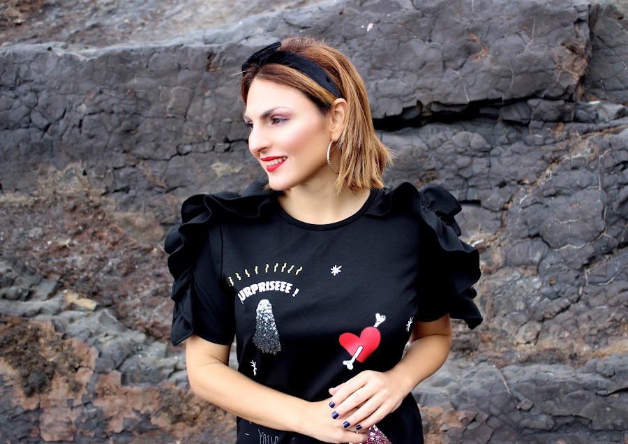Negro, corto, con parches y volantes en las mangas, creo que ya no se le pude añadir nada más a este vestido, están todas las tendencias juntas.