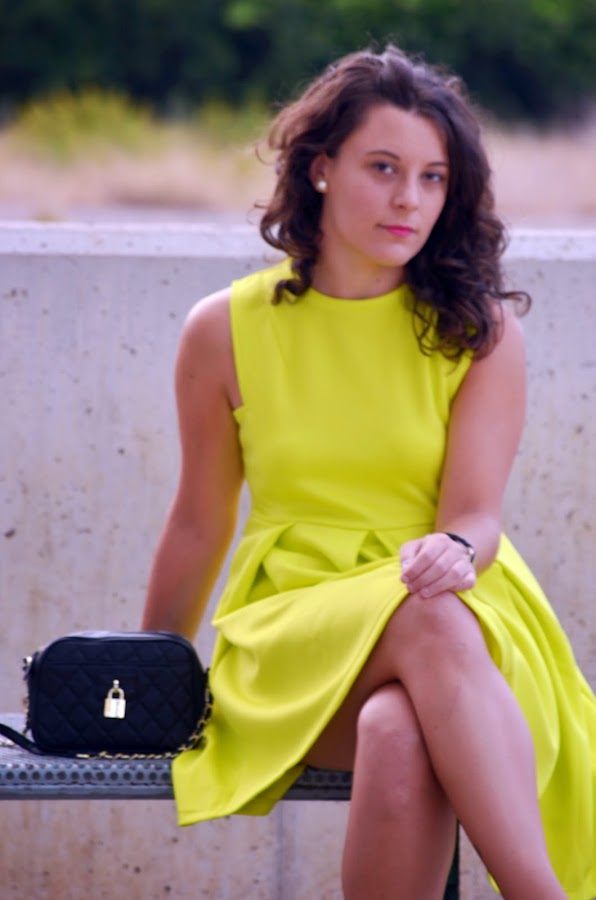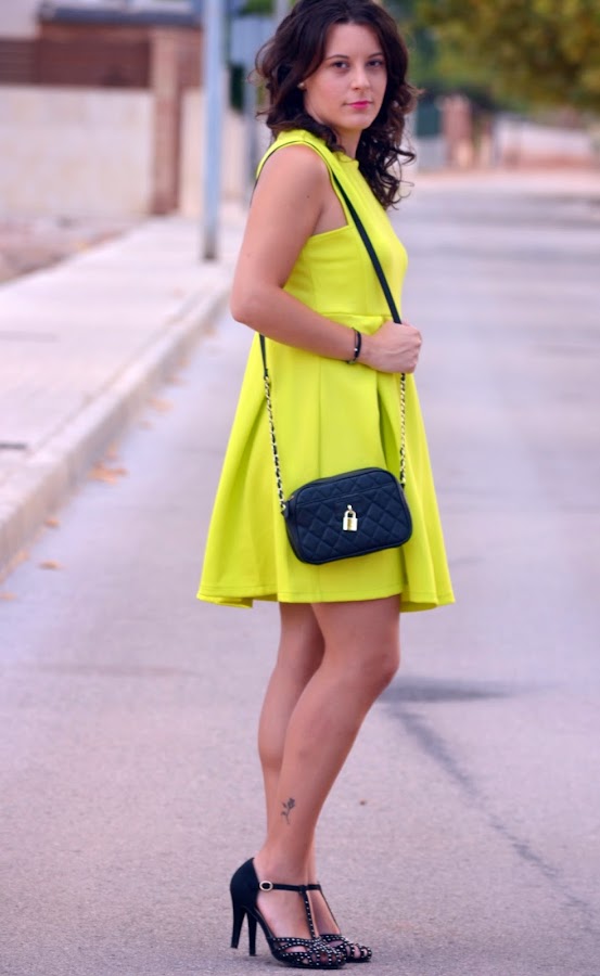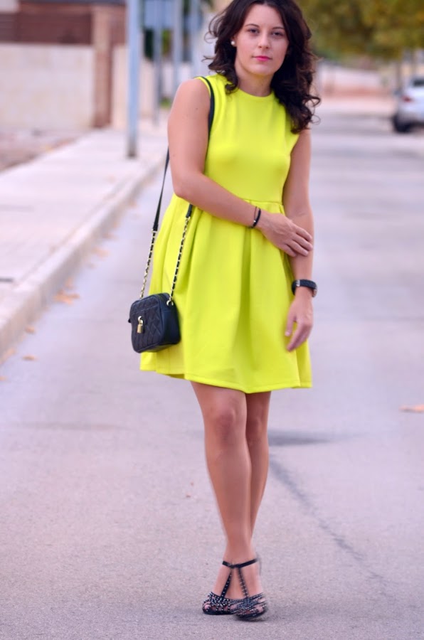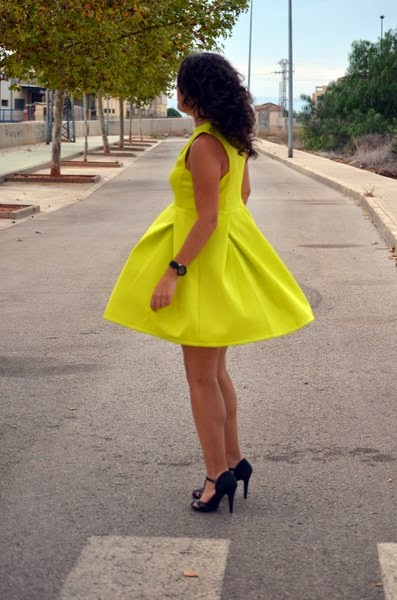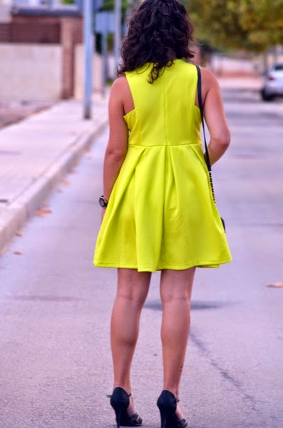 Ya se acerca el otoño pero aquí en el mediterráneo seguimos con días veraniegos. Las temperaturas durante el día no bajan de los 30º, y aunque algún día ha llovido un poco y ha refrescado, la mayor parte del tiempo sigue el calor insoportable.Hoy os traigo un look muy llamativo, y lo digo por el color verde limón intenso del vestido. Este vestido lo conseguí en el sorteo que hizo Patri del blog "El armario de una shopaddict" a principios de verano, yo fui la afortunada. Por motivos laborales y otras circunstancias aún no había tenido ocasión de ponérmelo porque es bastante atrevido (por el color).