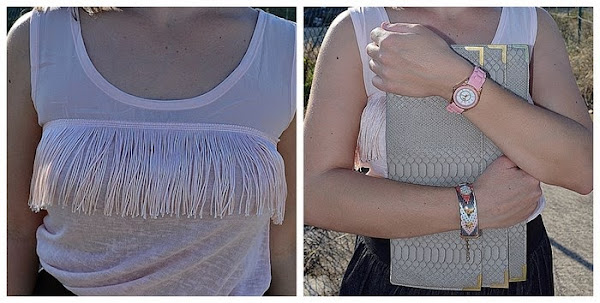 Hola! Hoy os traigo un look super low cost. Comenzando por la falda, he de deciros que formaba parte de un vestido. Era de Blanco y lo tenía de hacía por lo menos 4 años. La parte de arriba era de print animal y la de abajo denim en negro. Yo he aprovechado la parte denim. Le corté el top estampado y empecé a descoser poco a poco la goma que separaba ambos tejidos y al final con un poco de retoque...voilà! Falda nueva en tejido vaquero negro (y seguro que la voy a usar un montón). La he combinado con una camiseta que me compré en un mercadillo por poco más de 7 euros. Me gustó nada más verla por el color rosa pastel y por el detalle de los flecos, que es lo único que tiene de especial, pero la hace super original. Perfectamente podemos hacer una camisa así. Cogemos una camisa básica, compramos tela de flecos y lo cosemos. ¿Qué os parece mi nueva falda?
