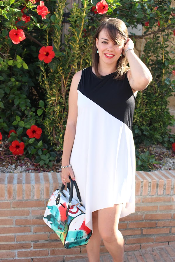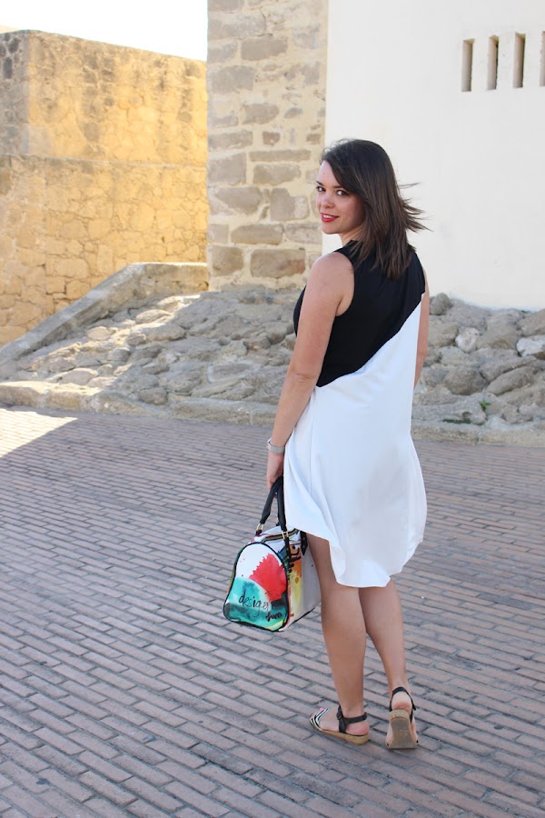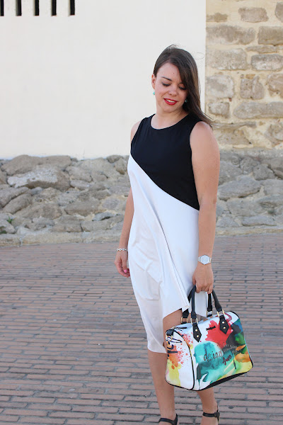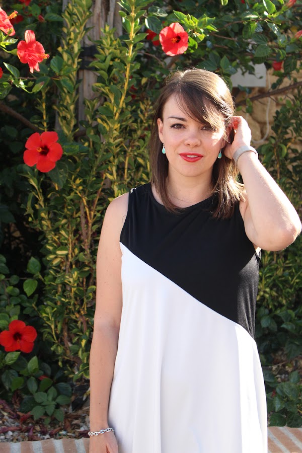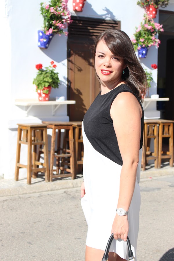 El otro día, estando en la playa, fuimos a pasar la tarde y visitar Conil, que no lo conocía y estrené un vestido en blanco y negro, con corte asimétrico que en principio no me acabó de triunfar mucho, pero oye, le estoy cogiendo el punto y aunque no sea un vestido para ponerme muy a menudo, me gusta.