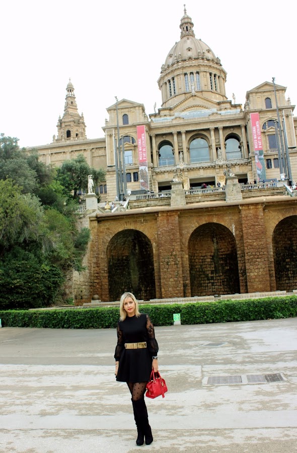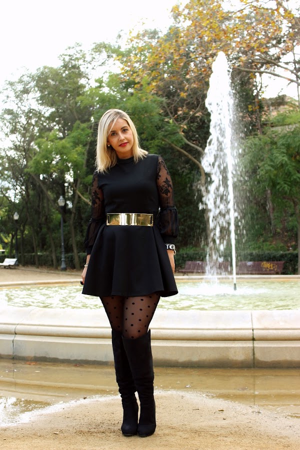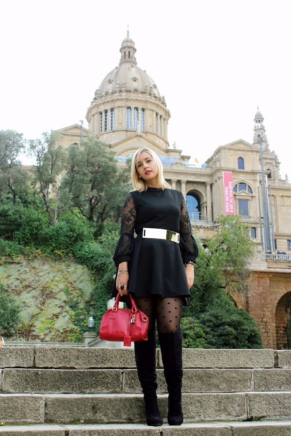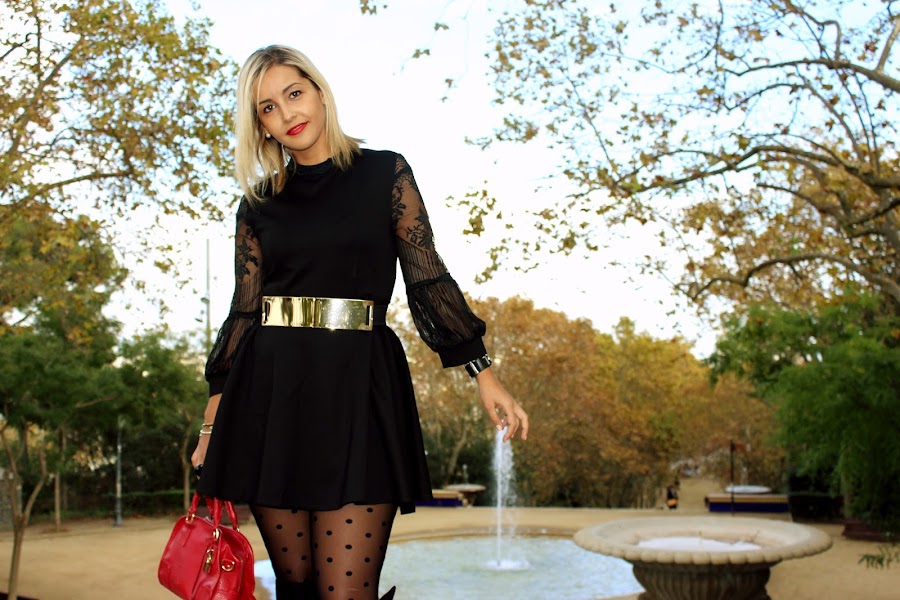 In the outfit of the day, I show you my new black dress with lace sleeves of the web Dresslily that I discovered some weeks ago and I liked it because they have a big variety of clothes and accessories a very good price. In addition, the shipping is free and quickly. I wear the dress with a coat similar to cape, a black boots over the knees, a golden belt and a red bag to give a touch of colour to the outfit.