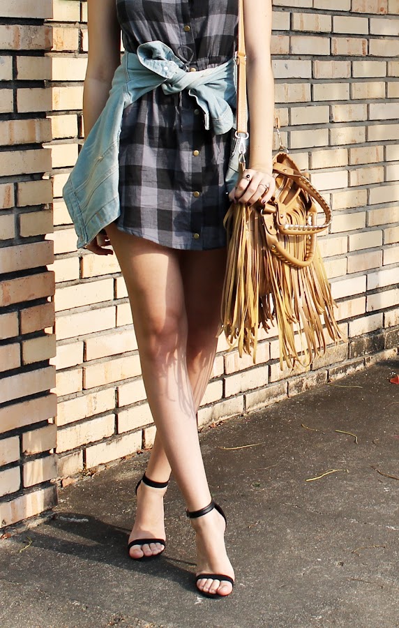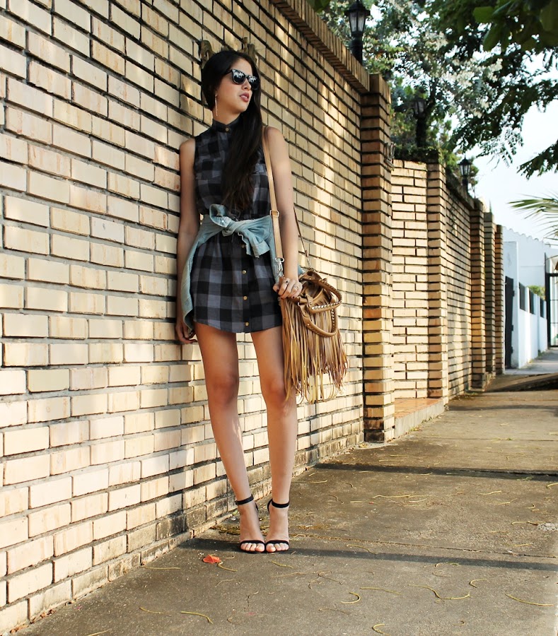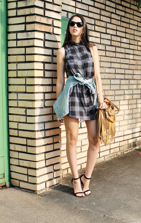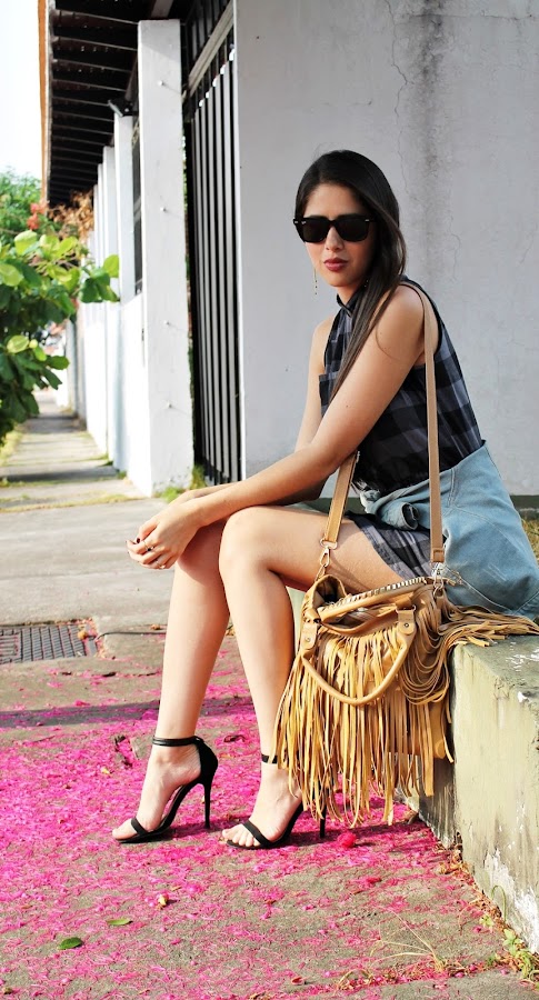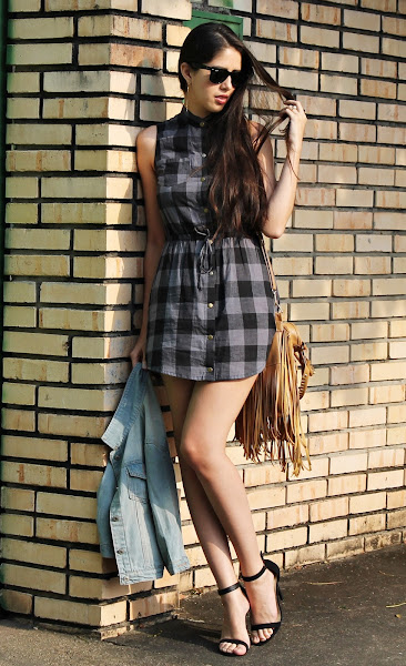 Los vestidos tanto de cuadros como de rayas se han convertido en un básico que debes tener, por su versatilidad ya que puedes formar looks tanto informales como formales con los mismos. En este ocasión como pueden ver estoy usando uno de cuadros estilo camisa que ¡Me encanta! Decidí combinarlo con esta chaqueta de jean a la cintura, unas sandalias negras simples y un maxi bolso de flecos que le da ese pop diferente a todo el outfit.