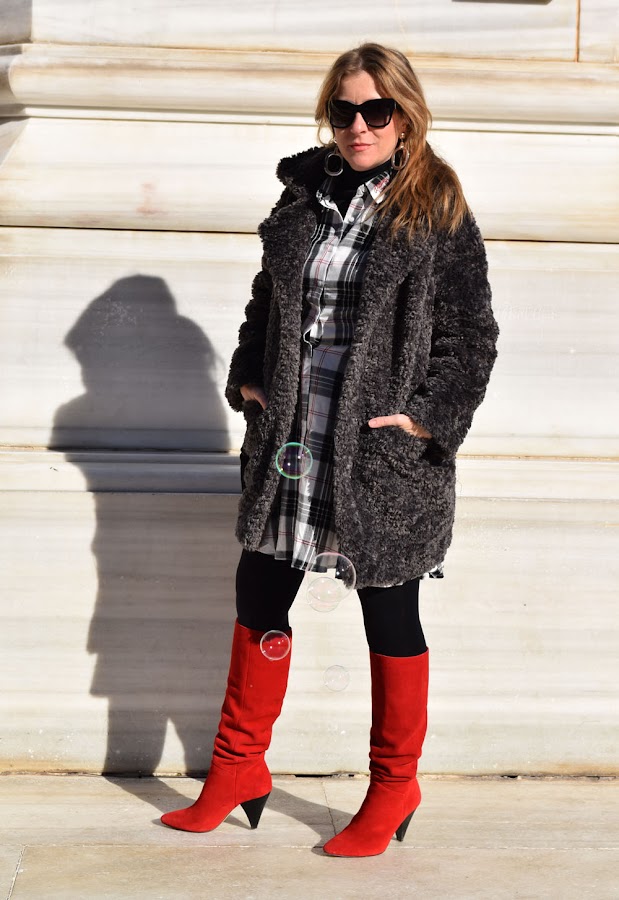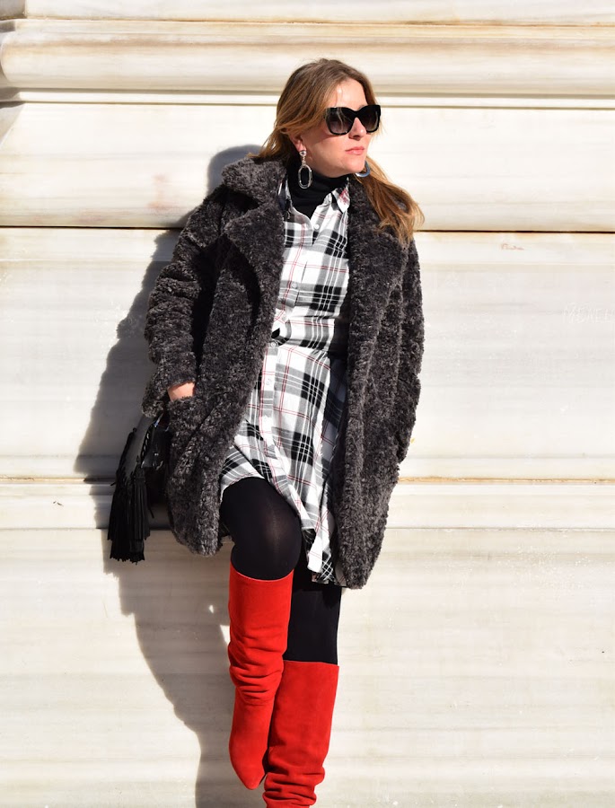 Para completar con los tonos grises del vestido, un abrigo estilo peluche que es puro calor.