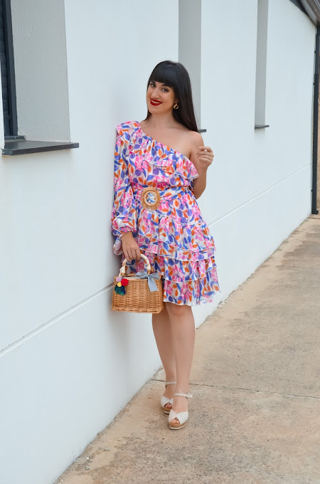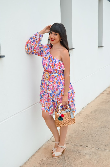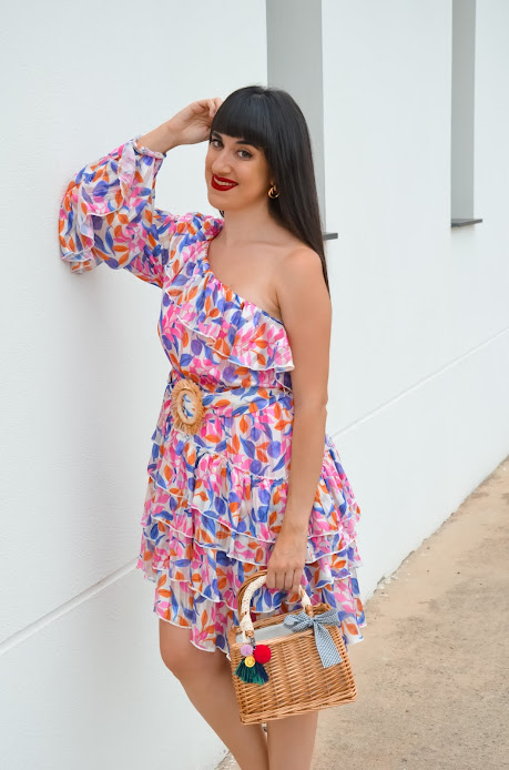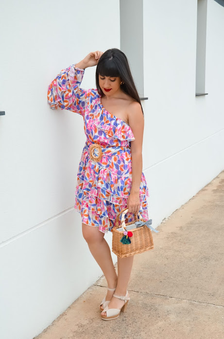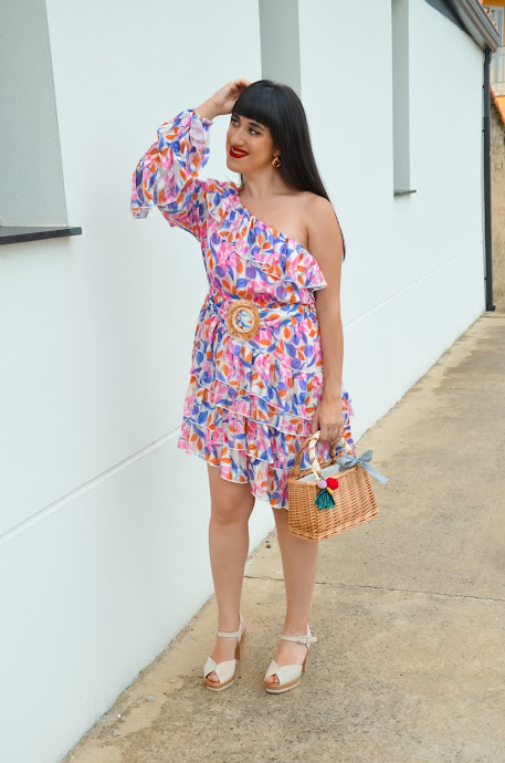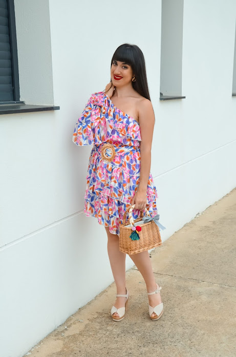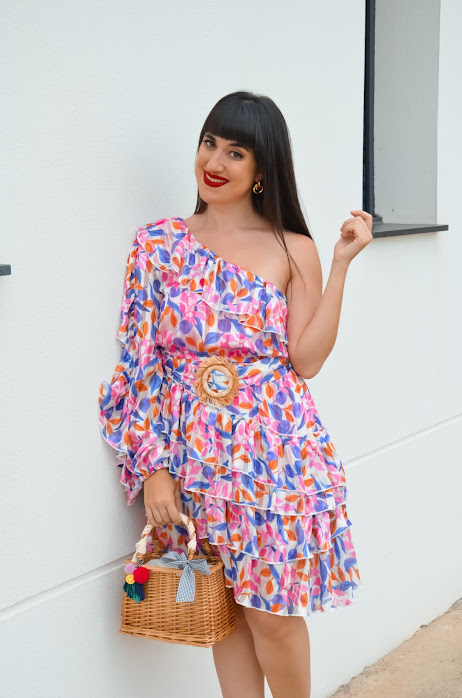 Tiene una combinación de colores alegre y la asimetría tanto en la falda como con el detalle de un solo hombro, le da ese toque que le hace una prenda de lo más especial y femenina.