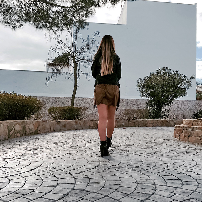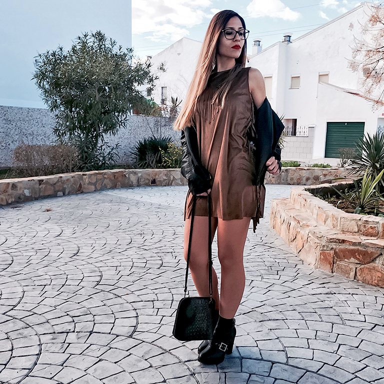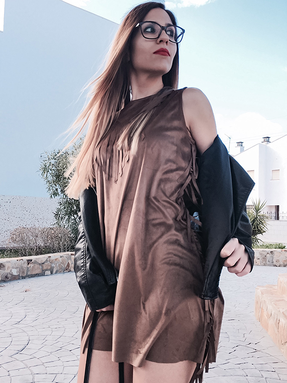 Muchos flecos y tejido de ante, dos tendencias que llevan con nosotros desde la primavera pasada, y se han quedado con nosotros hasta ahora. El protagonista del look de hoy es sin duda, este precioso vestido de tirantes, con un tejido de ante y flecos en los laterales y en el escote.