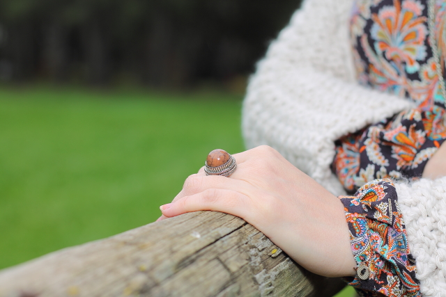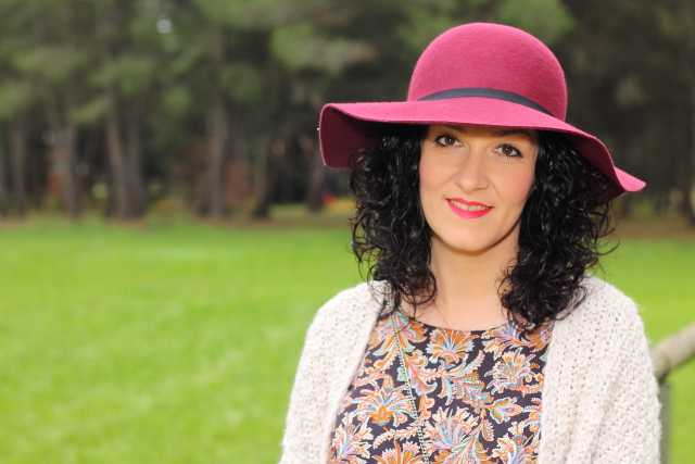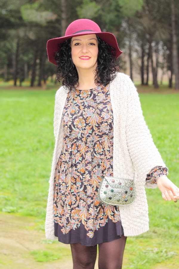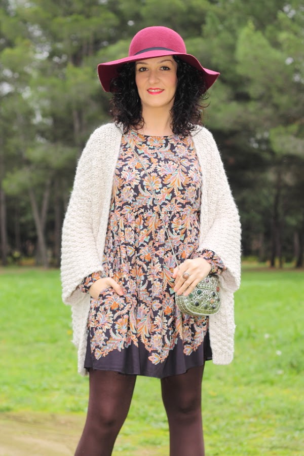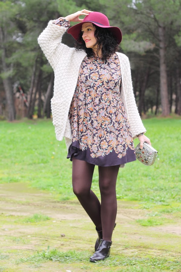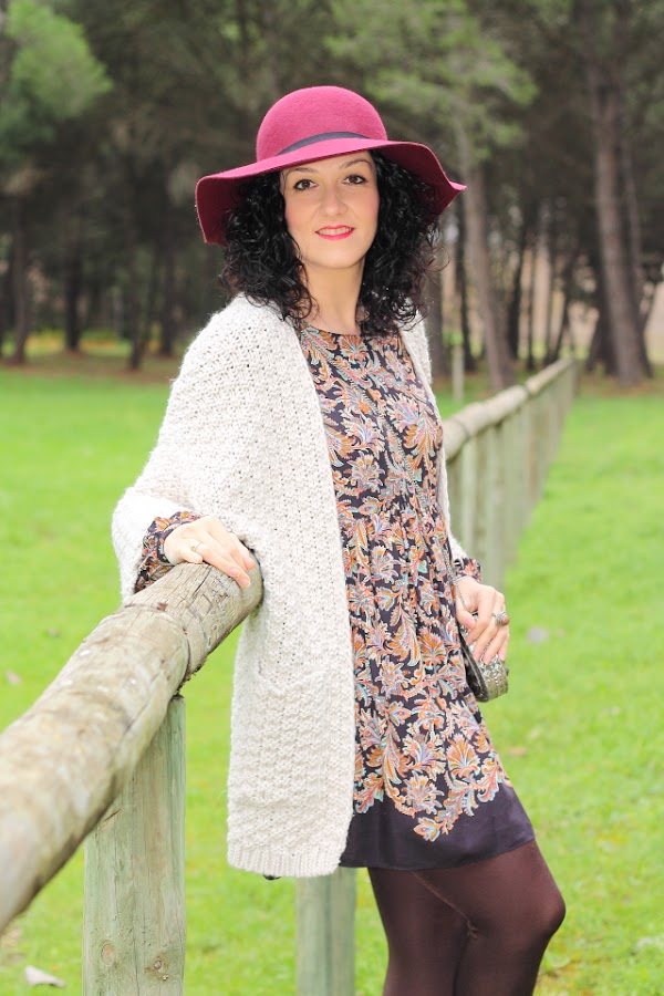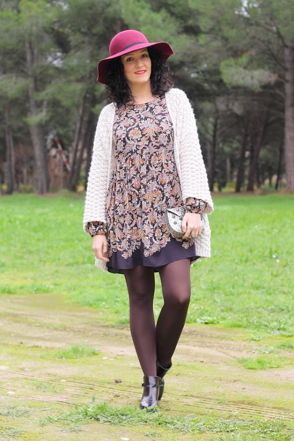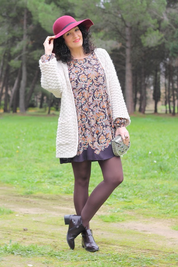 Los vestidos como el que llevo hoy me encantan, tienen un corte que los hace comodísimos y muy favorecedores en todos los cuerpos porque no marcan nada. Esta temporada Zara ha sacado unos cuantos de ellos y con lo que me gustan he aprovechado para comprarlos. Hoy llevo uno en tonos marrones con un estampado de flores precioso. Lo he acompañado de esta fantástica chaqueta de punto gordo y corte kimono que ya me habéis visto en negro aquí y aquí. Para los complementos me he decidido por un fedora granate y bolso metálico. Los botines burdeos me gusta mucho como quedan y además son geniales porque con el taconcito que tienen puedes andar y andar sin notarlos.