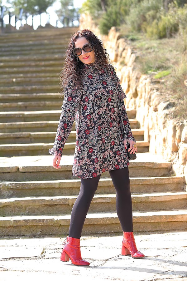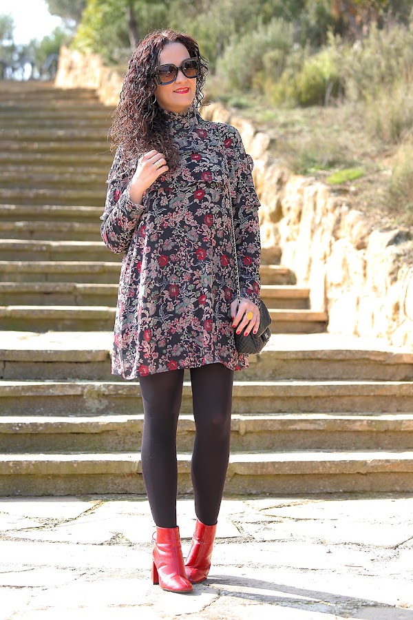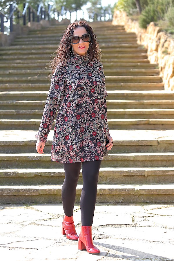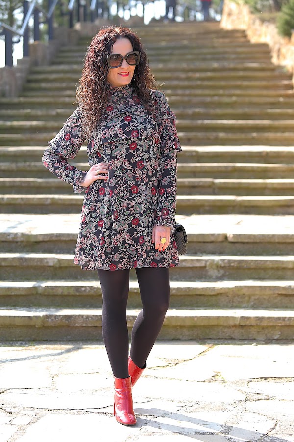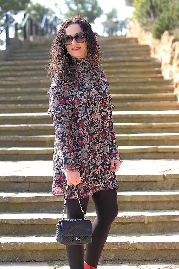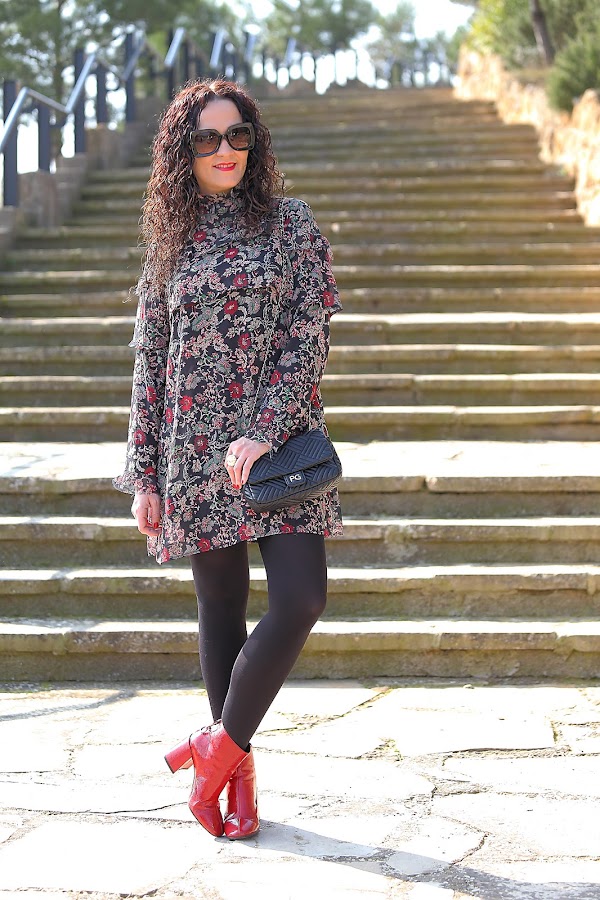 Para terminar la semana os enseño este look en el que llevo un vestido con estampado de flores. Espero no cansaros pero... ¡qué le voy hacer si me gustan tanto las prendas con flores!. El vestido de hoy me enamoró por el tejido flojito y los volantes en pecho y puños. Hoy lo llevo con mis botines rojos, sí, desde que me acordé de ellos y los me llevé para mis vacaciones es que no me los estoy quitando. Como bolso esta joyita de Purificación García que ya me lo habéis ido viendo desde hace unos días. Lo tenía en mente y mi madre que lo sabía se adelantó y me lo regaló por sorpresa, siempre tan buena y tan detallista conmigo. Si es que el dicho es pura verdad, ¡madre solo hay una y la mía es la mejor!.