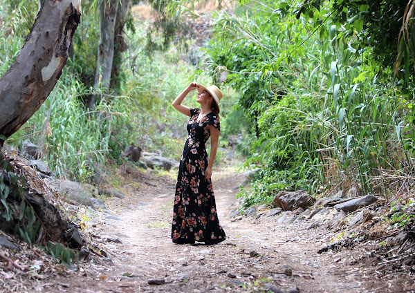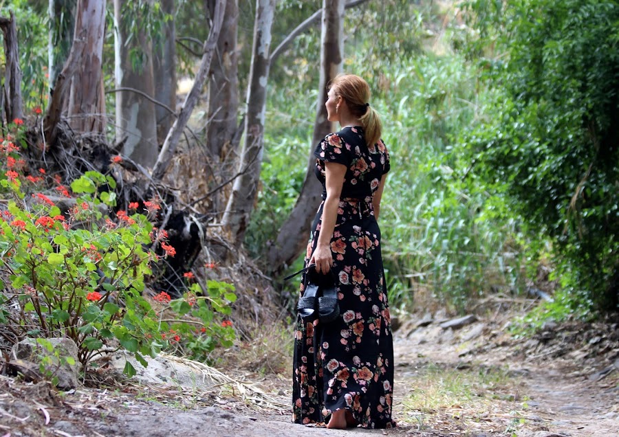 Las reinterpretaciones del estampado se cuentan por cientos y la gama de colores y vocaciones es tan grande que tiende al infinito. En el look que nos ocupa hoy el vestido tiene unas flores románticas de tamaño medio con un fondo negro.