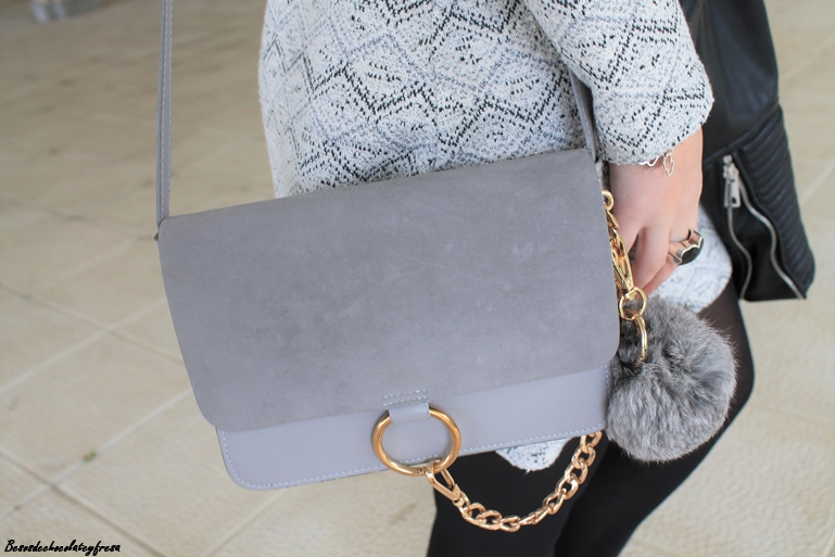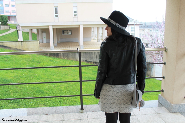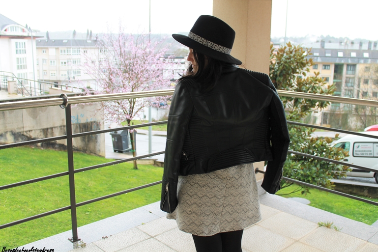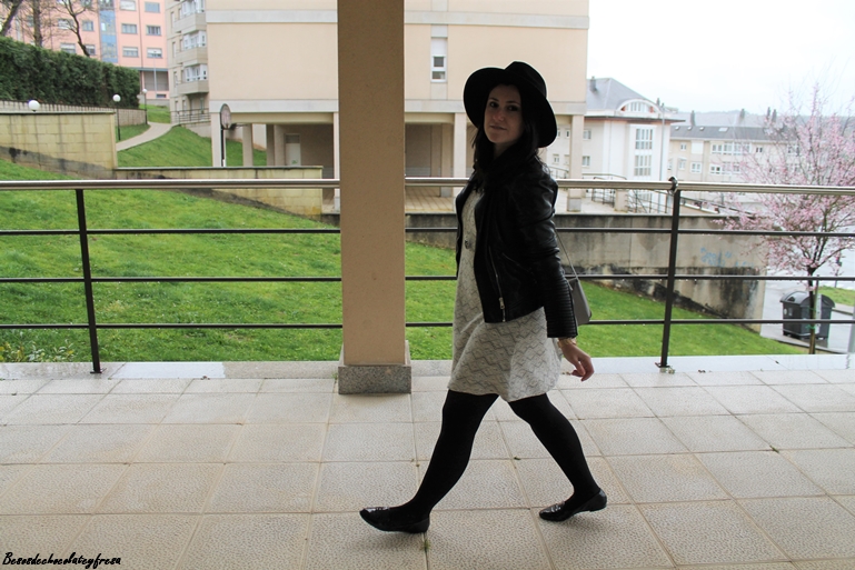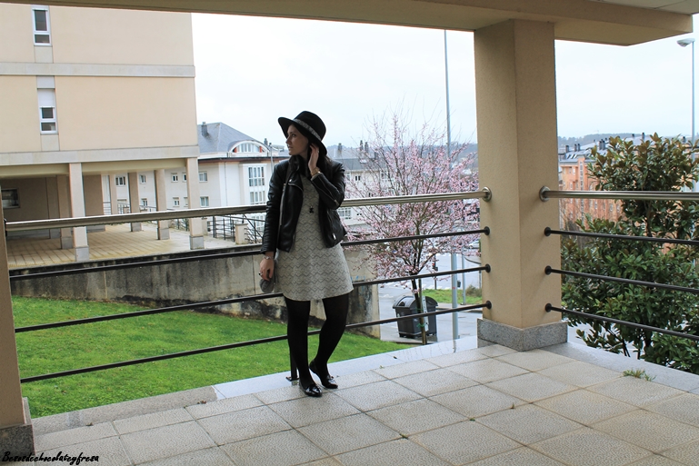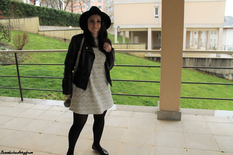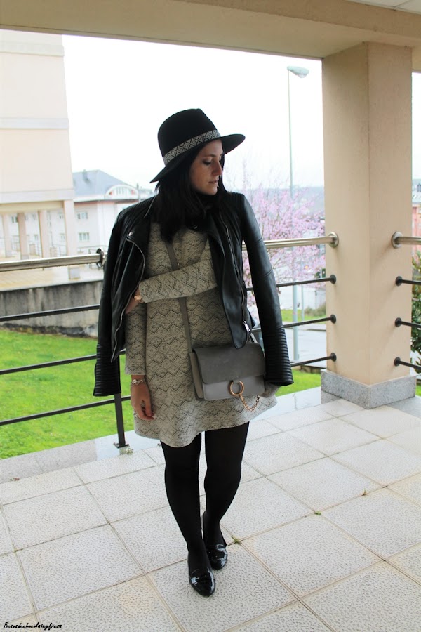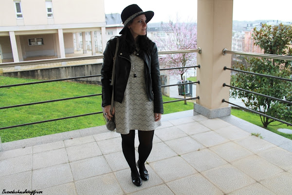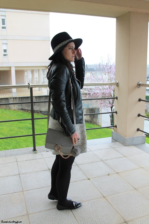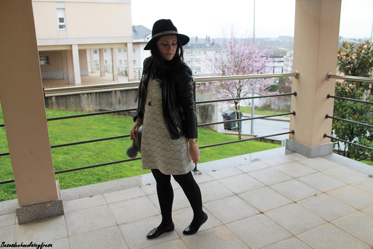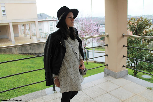 En tonos grises con incrustaciones plateadas que lo hacen brillar, es apto tanto para el día como para la noche modificando los complementos. Es de Besosdechocolateyfresashop y en esta ocasión decidí apostar por tonos neutros en negros y grises, como son los mocasines acharolados, biker, collar de oso Tous, sombrero y bolso gris de piel y serraje.