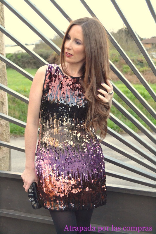 Llegan las navidades y me encanta brillar, creo que son las mejores fechas para lucir uno de esos vestidos deslumbrantes cargados de brillos y lentejuelas que te hacen sentir especial y que atraen todas las miradas. Y eso fue lo que me pasó con el que elegí para la cena de Nochebuena y posteriores copas con amigos, que me atrajo según lo vi en el escaparate de La Folie. Me pareció impresionante, un vestido joya de esos que hay que tener en el armario y que te sacan de cualquier apuro, además me encantó la combinación de varios colores, entre ellos el granate tan de tendencia esta temporada y el efecto degradé que se crea entre ellos. Los complementos muy discretos, un maxi anillo de plata y un clutch negro, este vestido no necesita nada más.