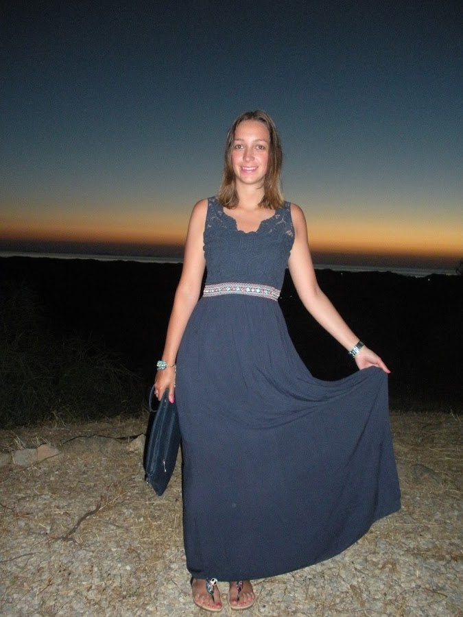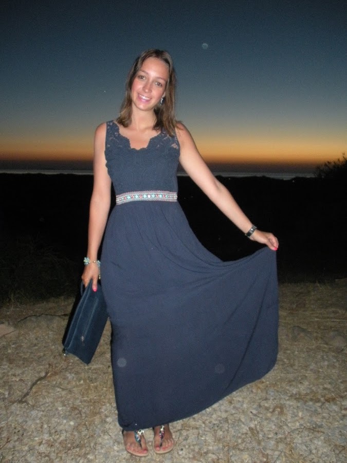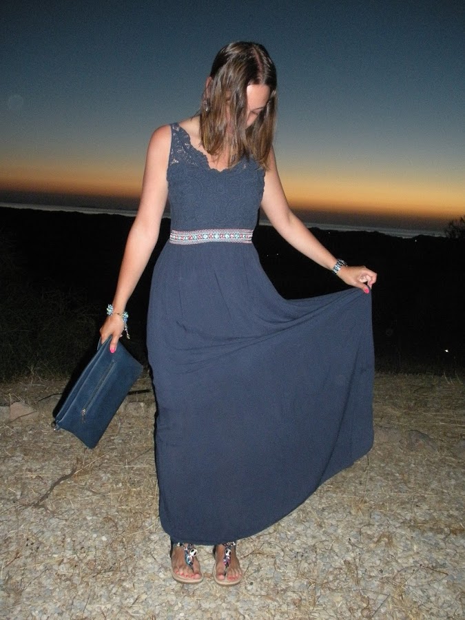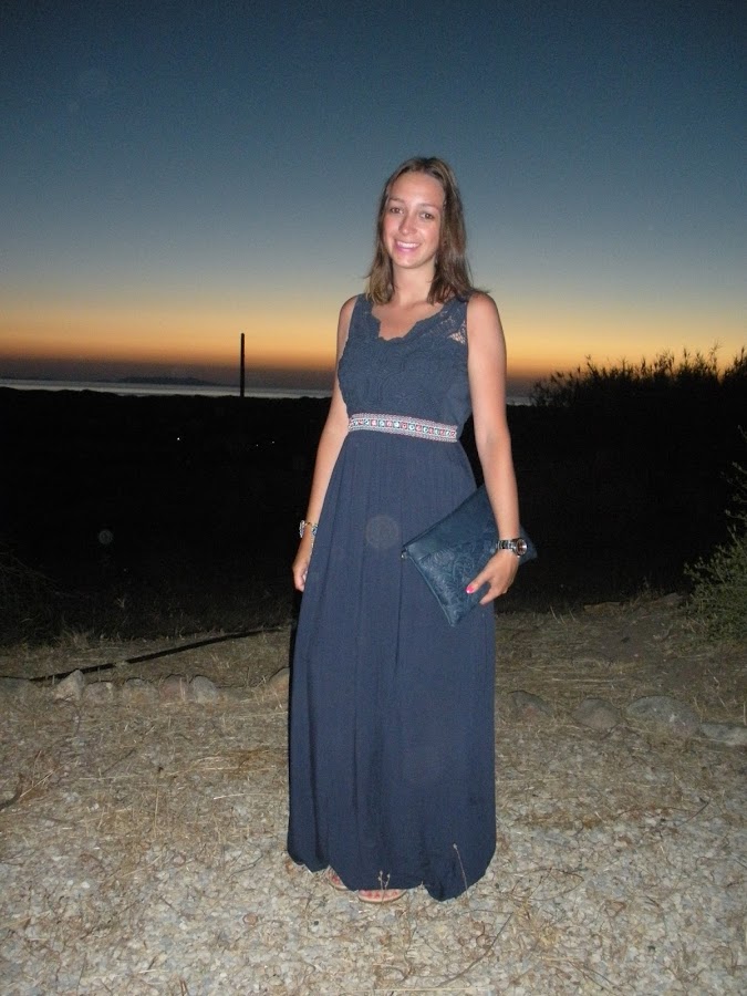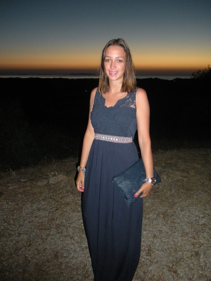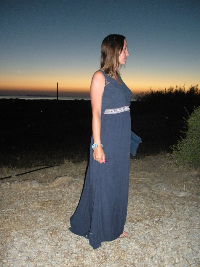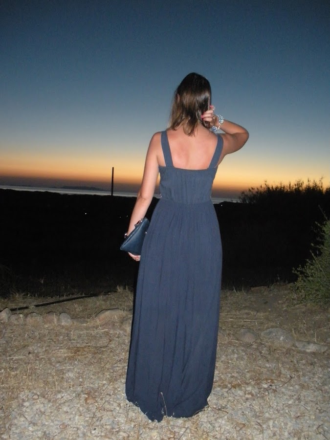 Para una de las noches en Cerdeña opté por un vestido largo en azul marino que compré en el mercadillo durante las fiestas de San Pedro. Lo completé con mis sandalias y mi clutch también azules.