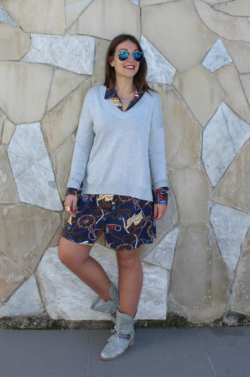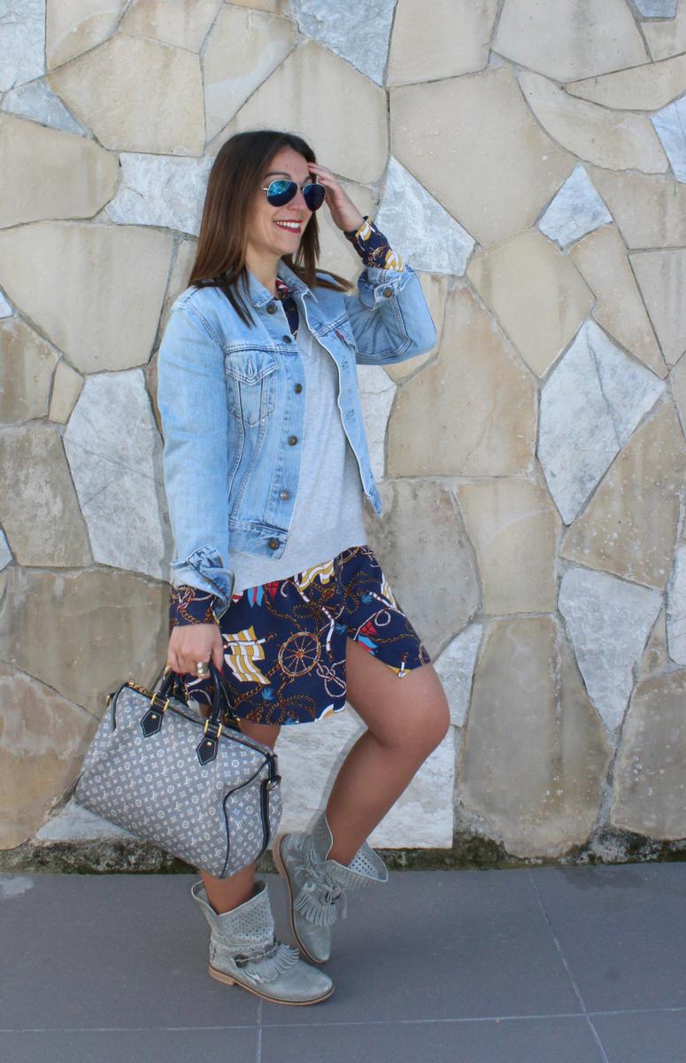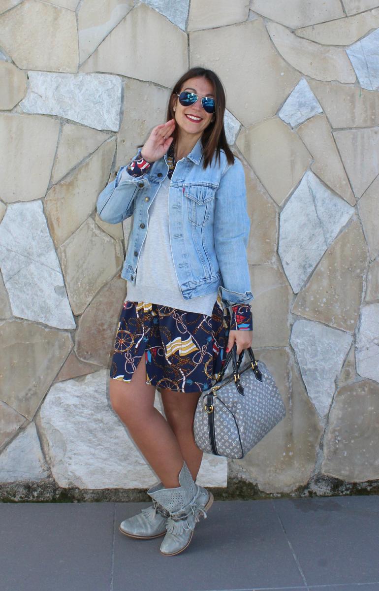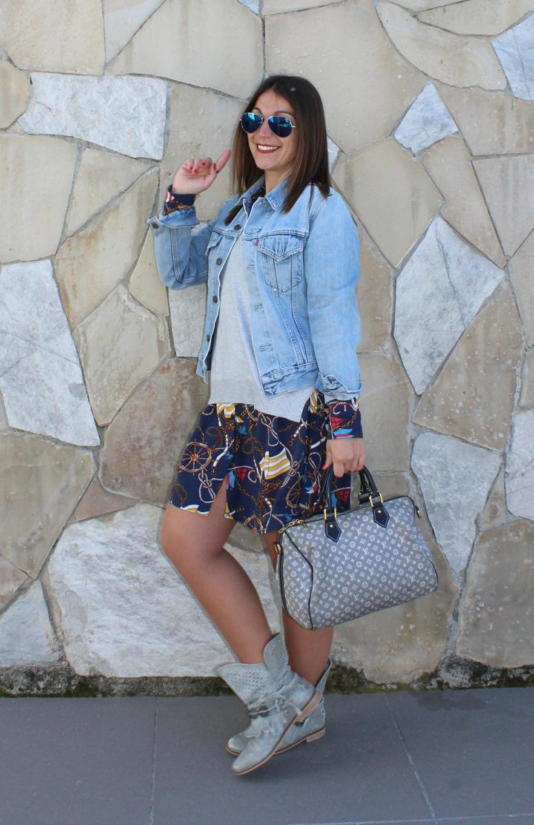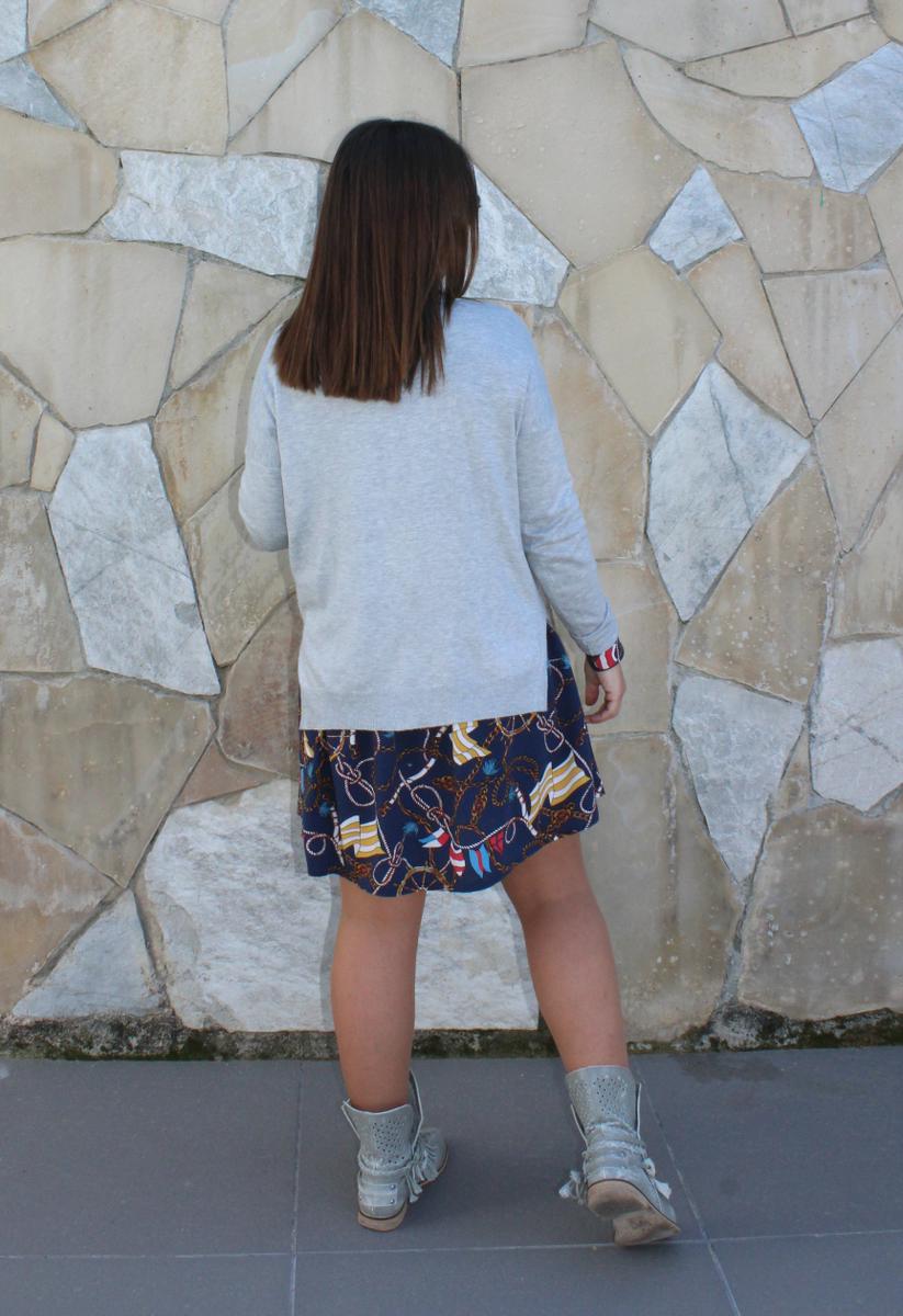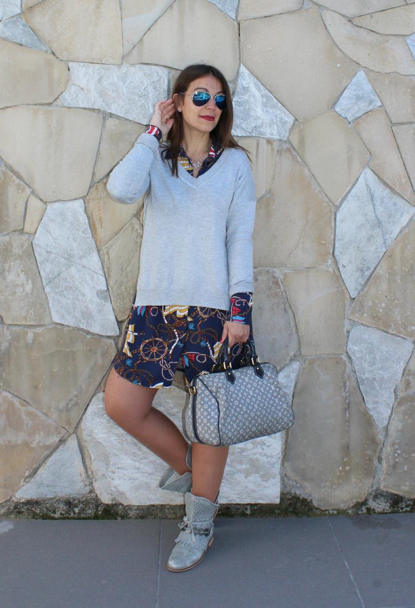 En este caso he usado el vestido a modo de falda, ya que lo he complementado con un cardigan finito en un color gris muy suave, botines y cazadora manteniendo este mismo tono claro.