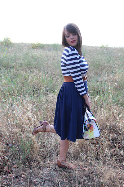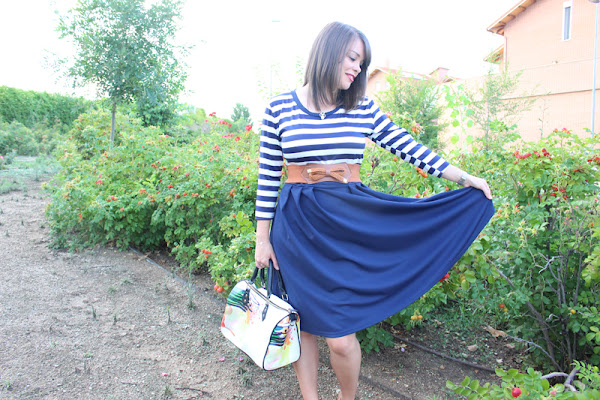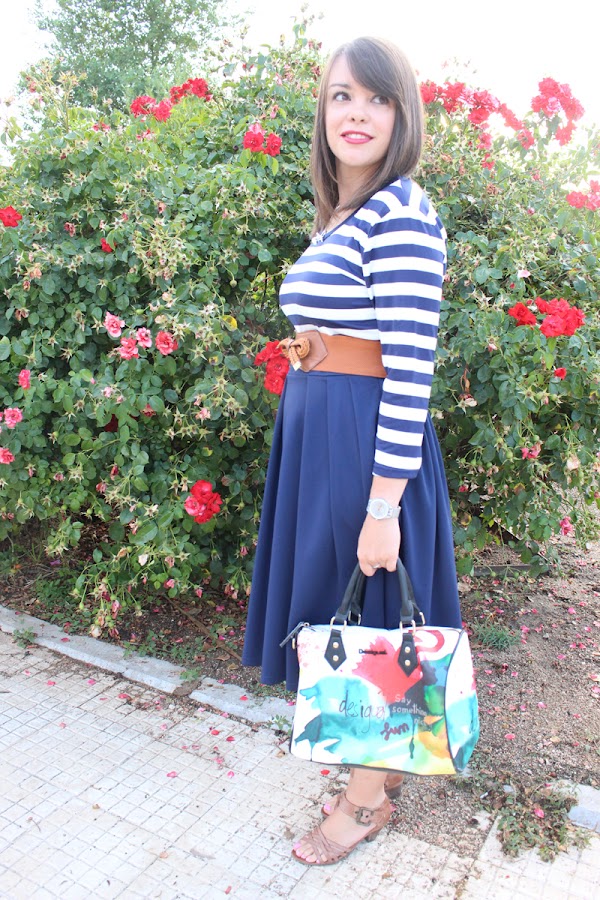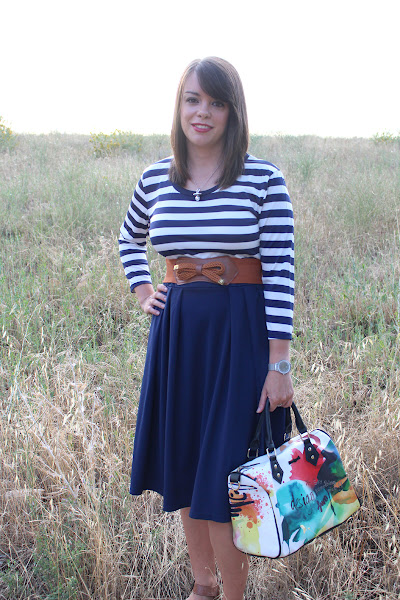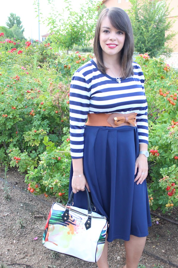 El vestido marinero es de manga casi larga, yo diría que 3/4 y la falda de largo llega justo por debajo de las rodillas. Me parecía un estilo muy chulo, así muy de "Las chicas del cable" y me gustó mucho. La tela es cómoda y no es ni muy gruesa ni muy fina. Le añadí el cinturón elástico para darle un toque especial ya que sin cinturón el vestido marinero se quedaba un pelín soso, se notaba que le faltaba algo y además, no se ajustaba a la cintura pero con el cinturón, ¡todo solucionado! Y el toque de color del look se lo lleva el bolso de Desigual, que lo uso mucho en verano, me parece ideal para esta época del año :)