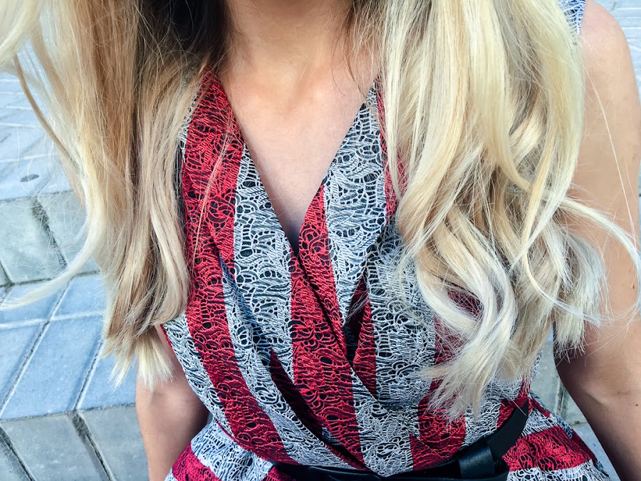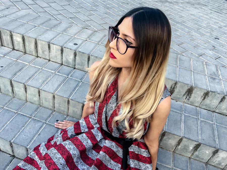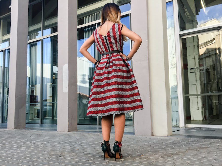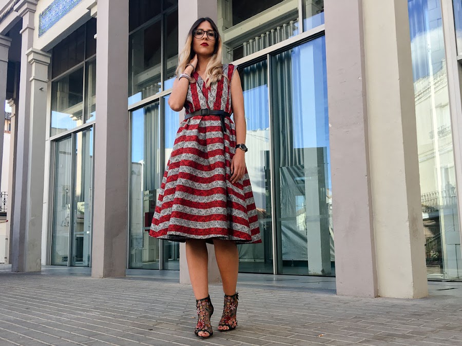 El vestido que os traigo hoy es una preciosidad y es perfecto para cualquier evento, aprovechando que ya estamos en la épocas de las famosas BBC, Bodas, Bautizos y Comuniones. El vestido es de corte midi, de estilo globo, con un escote, espalda con cremallera y con un estampado de rayas rojas y grises con un cinturón.