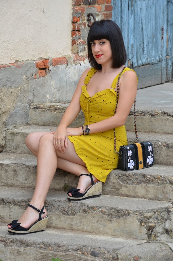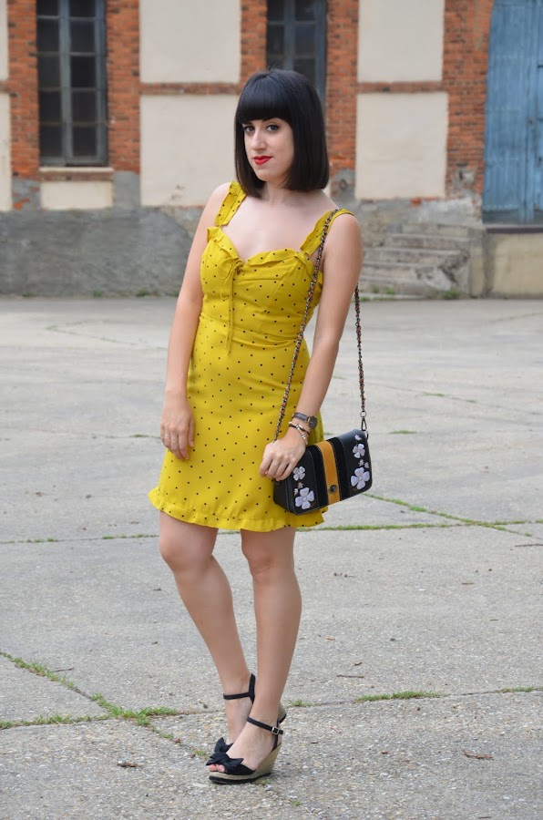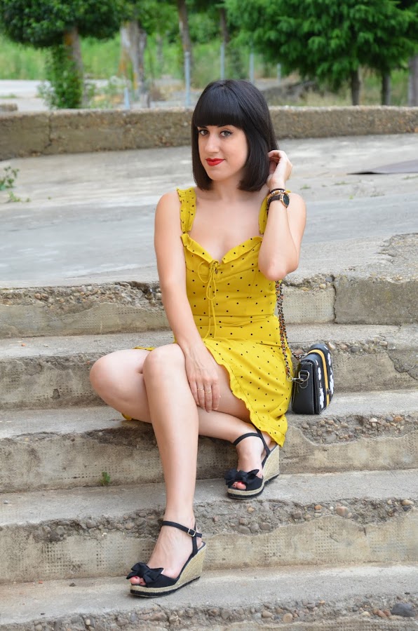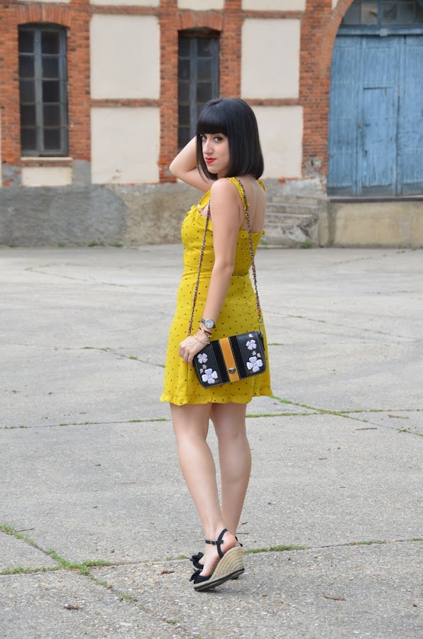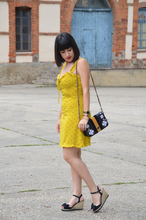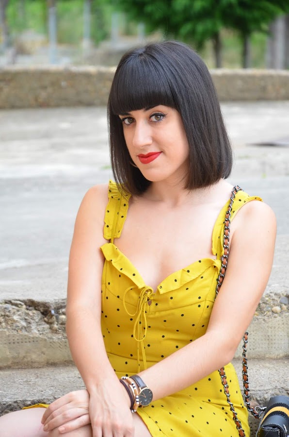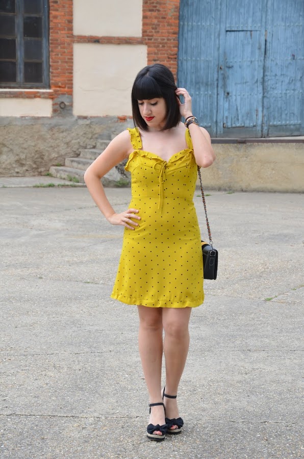 Aun así, antes de que se pusiera a diluviar, nos ha dado tiempo a hacer unas fotos para enseñaros el look de hoy con este vestido mostaza con topitos negros de Zaful. Es una cucada de prenda, super femenino y muy preppy.