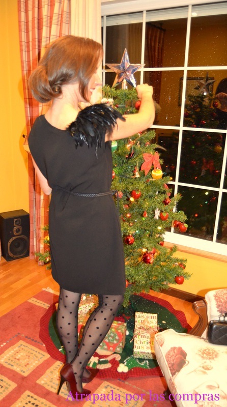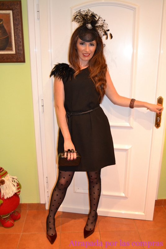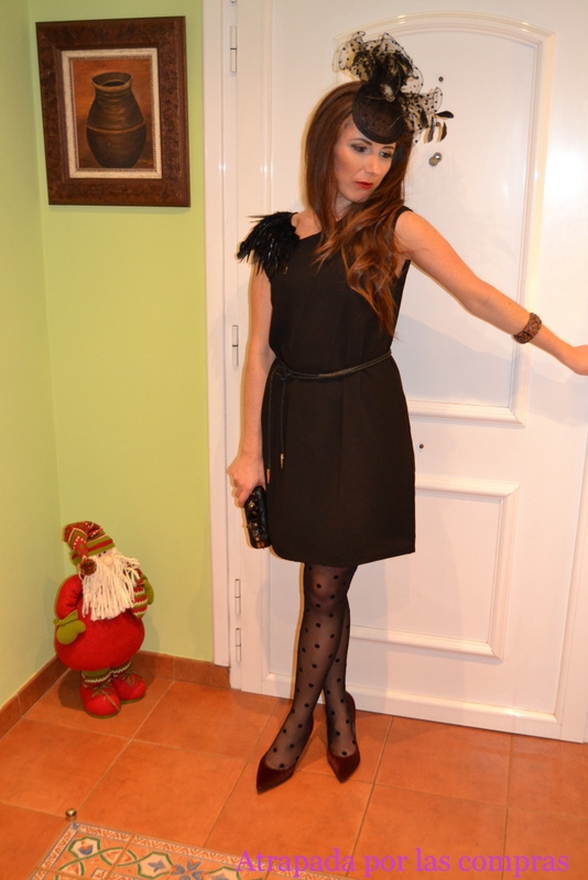 En el post de fiesta de hoy os enseño dos looks distintos con el mismo vestido, únicamente se cambia el peinado. En esta ocasión me he decantado por una alternativa segura, el lbd (little black dress), pero un lbd muy especial. Destaca, por un lado, su escote asimétrico, los cortes asimétricos son tendencia desde hace varias temporadas y no sólo en los largos, un escote asimétrico hace de un vestido, por ejemplo, una prenda especial y diferente. Y por otro lado, las plumas sobre el hombro derecho, un detalle que aporta sofisticación y elegancia al vestido sin resultar recargado. Al tratarse de un vestido rectangular le he añadido un cinturón que marque la cintura y defina un poco la figura. En cuanto a los complementos me apetecía meter algo de color pero sin resultar agresivo, así que opté por uno de los colores de esta temporada, el granate, con unos zapatos y un conjunto de pulsera y anillo en ese tono. Otro complemento a destacar en el look, las medias, de topitos y con costura posterior muy años 50, son el mejor ejemplo de como un simple complemento como pueden ser las medias puede dar el toque final a cualquier look.