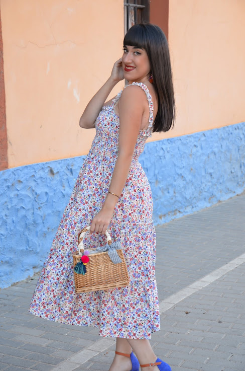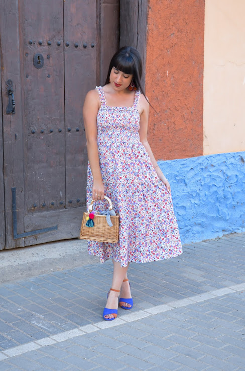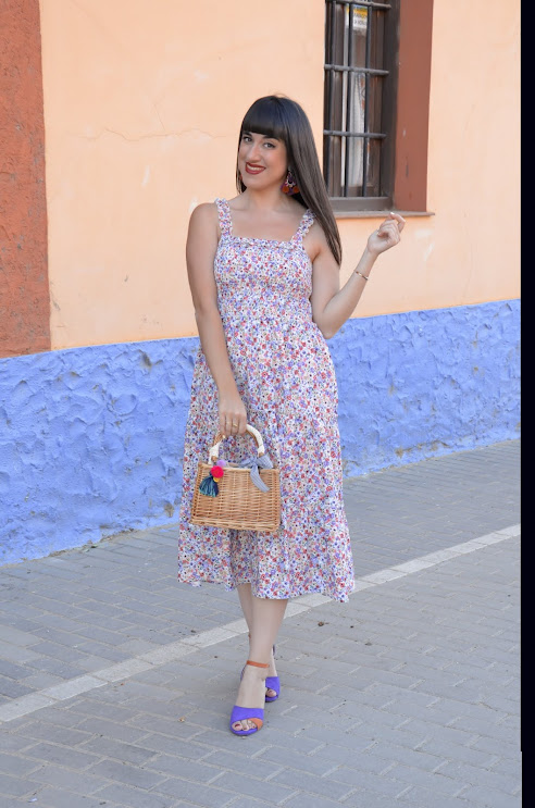 Este vestido es tan bonito... estaba buscando una prenda que me enamorase para poder estrenar mis nuevas sandalias en tonos morados y naranjas y cuando vi este vestido pensé que me podía encajar y lo cierto es que estoy encantada porque el vestido en sí es precioso. Tiene una tela muy fresca y el estampado es ideal para el verano y la primavera.