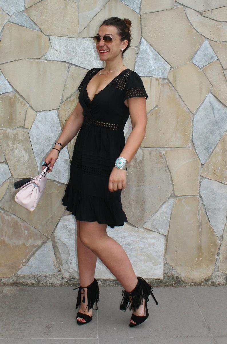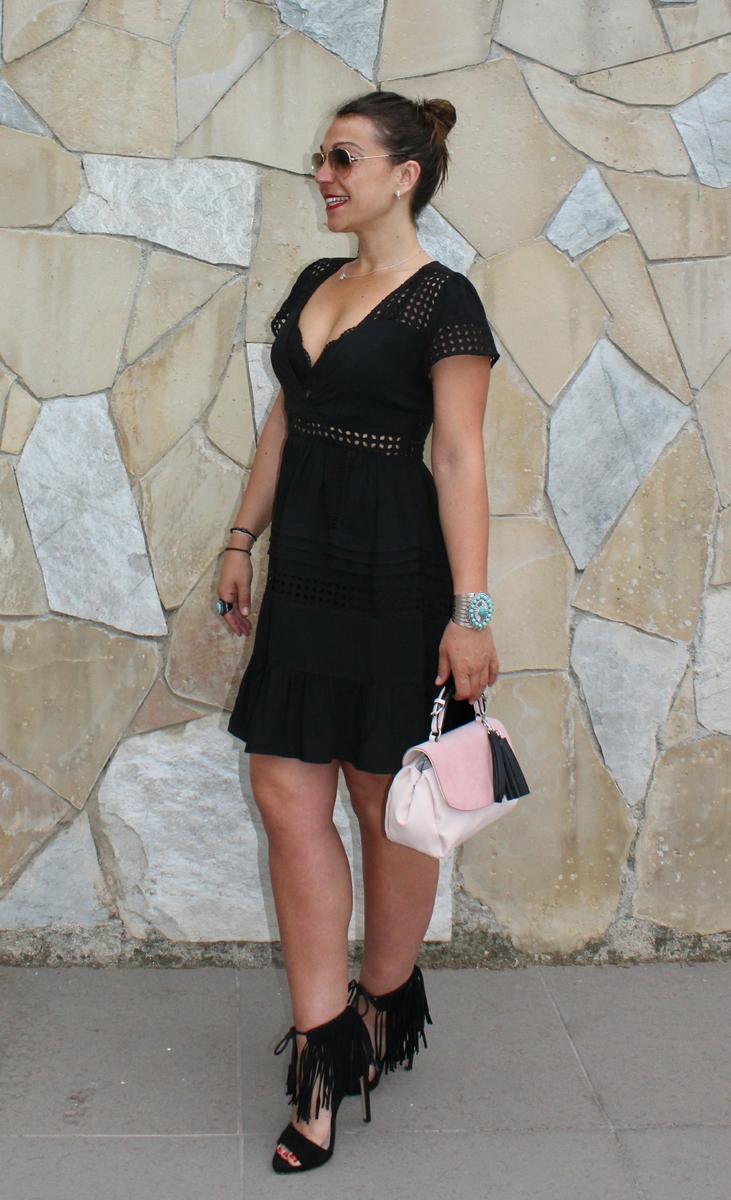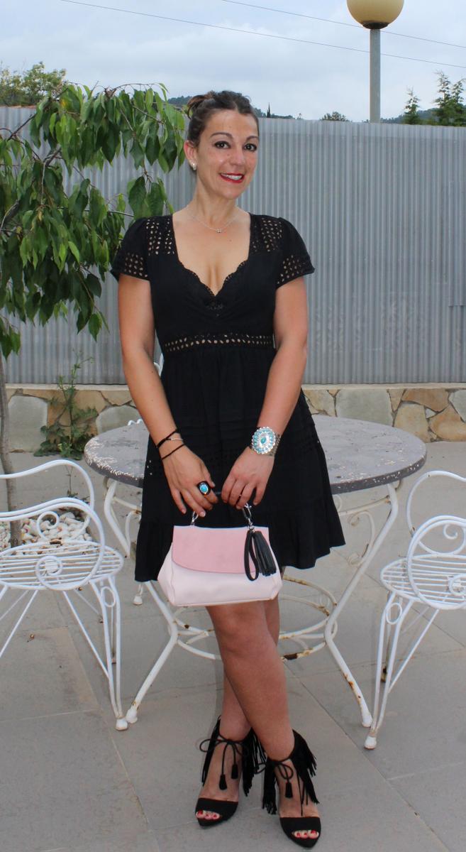 El look de hoy se compone de un vestido negro con escote en pico muy muy pronunciado, al que añadí un top lencero por adentro. Un vestido con corte en la cintura y linea evasé, un corte perfecto para todo tipo de cuerpos y siluetas, ya que marca la cintura pero disimula muy bien el exceso o no de las caderas. El tejido del vestido no puede ser más veraniego, ya que tanto las mangas, como la cintura va adornado con un perforado tipo bordado ingles.