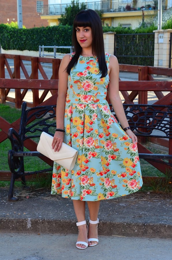 Si buscáis en las webs de moda online y buscáis en la sección vintage encontraréis un montón de prendas de esta tendencia, especialmente vestidos. La semana pasada os enseñaba uno de los que elegí en la tienda online ChicMe con print de cupcakes que podéis recordar AQUÍ. Hoy os enseño otro con print floral.