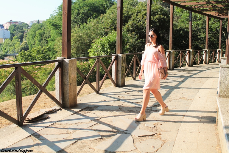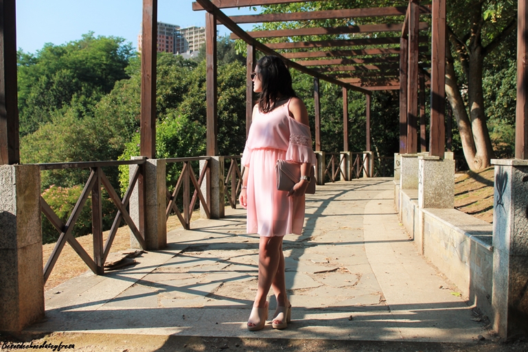 Hoy os muestro un look muy dulce a la vez que elegante, ya que se acerca el fin de semana, hay que recibirlo como se merece ¿verdad? Os muestro un look con vestido en rosa empolvado, color de esta temporada junto con el azul serenidad que lo combiné con nude. Es de mi tienda online @besosdechocolateyfresashop con detalles de crochet en las mangas, pues otra de las tendencias que tiene este vestido es que se trata de un vestido cutt shoulder, tirantes finitos con manga y hombros descubiertos.