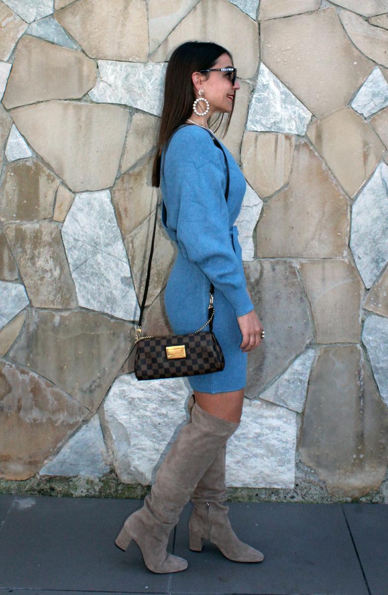 Esto es lo que pensé para decantarme por este vestido. Una pieza de punto con una mezcla entre vestido y suéter amplio. De cintura para arriba lo podríamos considerar un jersey de escote cruzado o en V, tanto por la parte delantera como por la trasera, y mangas anchas y de cintura para abajo una falda ceñida, y la combinación de ambos un vestido-suéter….jajajaja