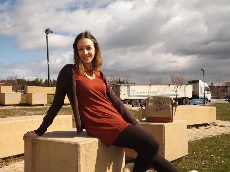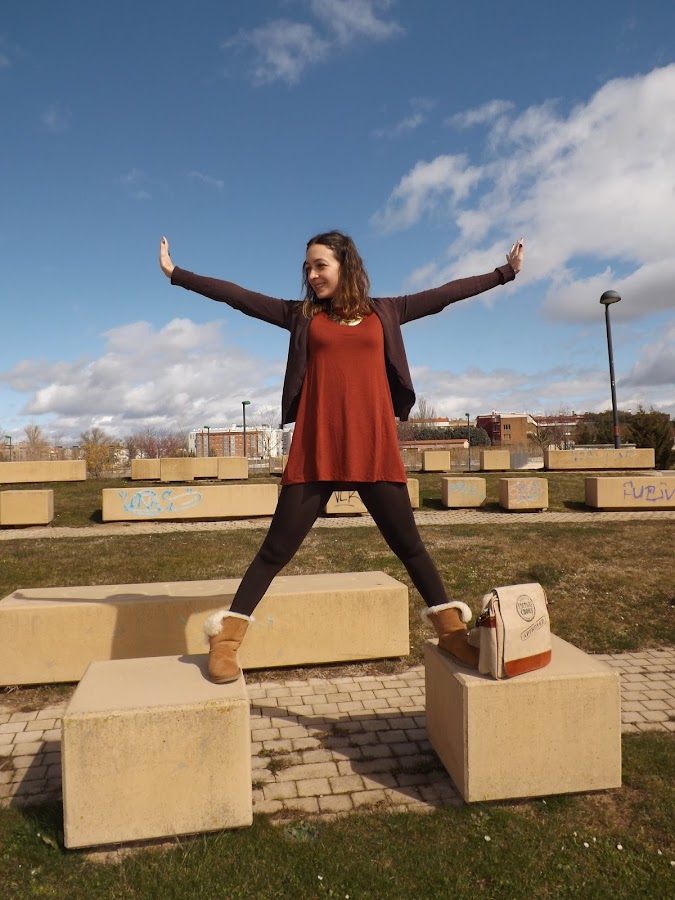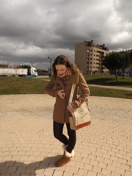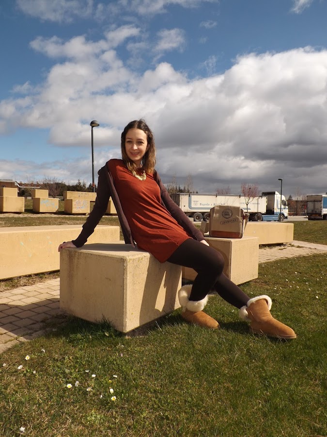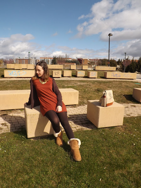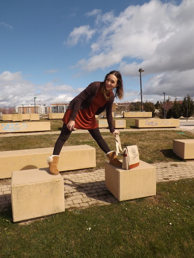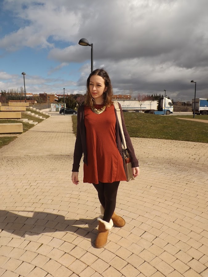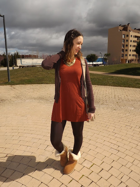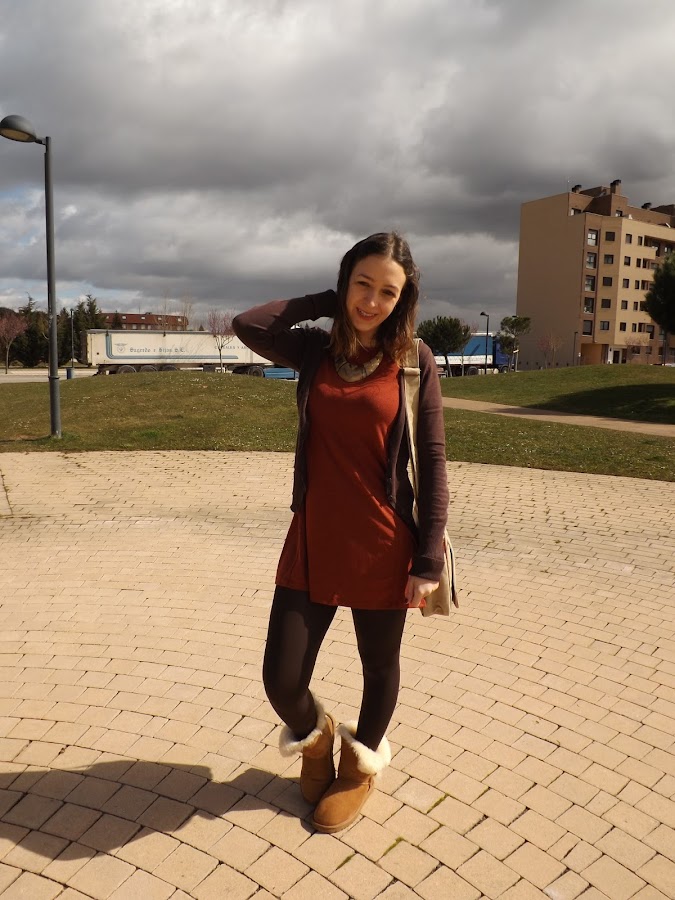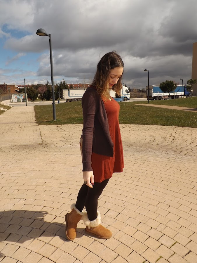 El look de hoy está formado en su totalidad por básicos. El vestido fue un chollo rebajil por 6 euros al que no pude resistirme, una chaqueta básica marrón (ando como loca buscando otra diferente en este tono pero me es imposible), mis adoradas y calentitas UGG y este bolso regalo de mi cumpleaños que para looks informales me parece de lo más cómodo.