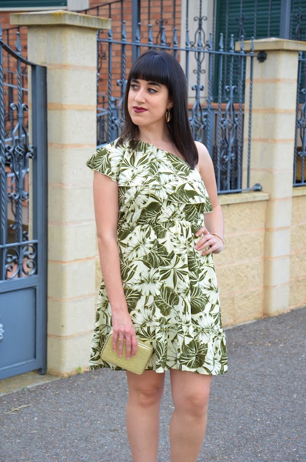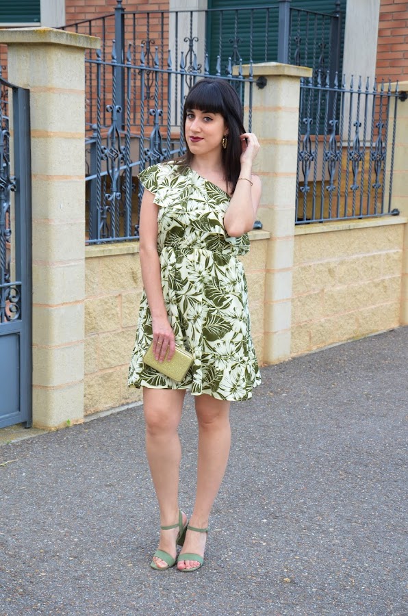 Este vestido de estampado tropical y manga avolantada y asimétrica de Shein es una auténtica maravilla. La combinación de colores no puede ser más bonita y veraniega y en cuanto lo saqué del paquete pude apreciar un detalle que en la web no se ve, y son esos destellos dorados en los bordes de las hojas que lo hacen aún más bonito si cabe.