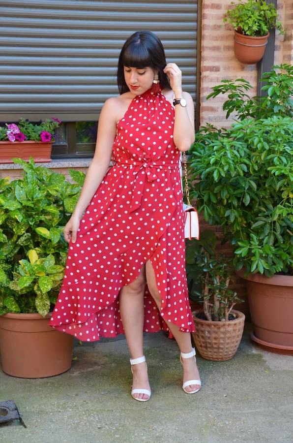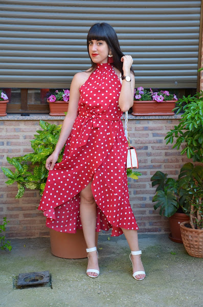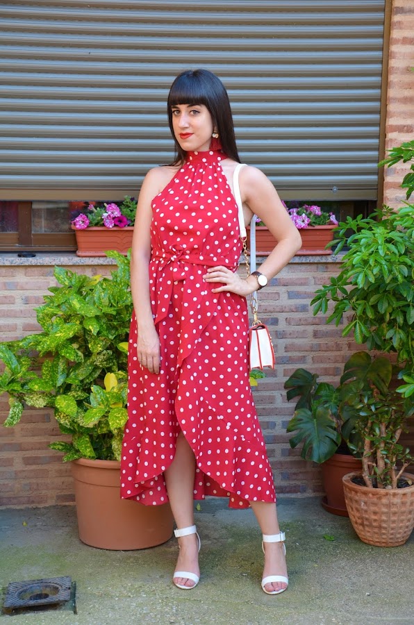 Por eso, hoy he querido estrenar este vestido tulipán rojo con lunares blancos de Shein. Tiene cuello halter con botón en el cuello, lazada en la cintura y apertura con volantes en la parte frontal.