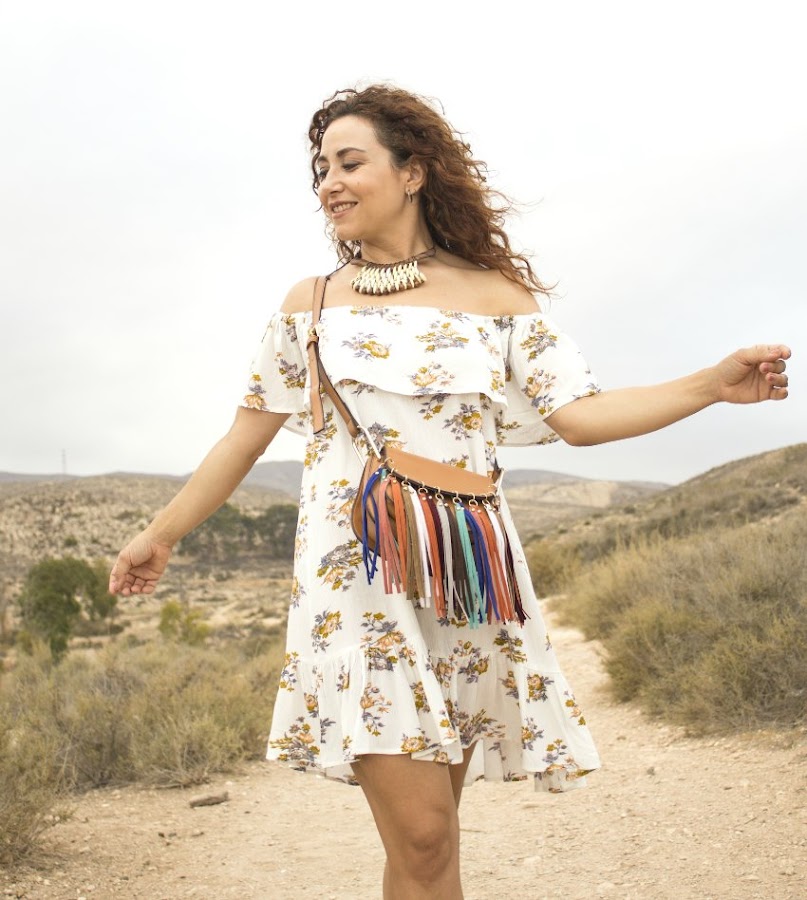 Hi everyone! How are you? I hope you are going well. In todays post I bring you a look that Ive been wearing all this summer but didnt took pictures already: vaporous dress (light and cool) bare shoulders with a cute fringe bag simil Chloé (here, very nicely finished and combinable) , and mustard sandals rescued from the summer sale ( poor they, what would have they done without me X-) )
