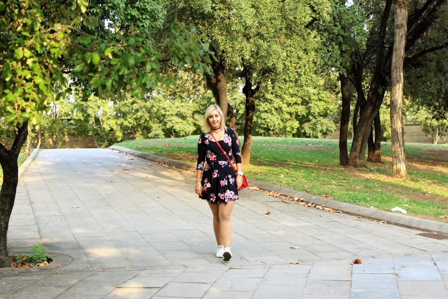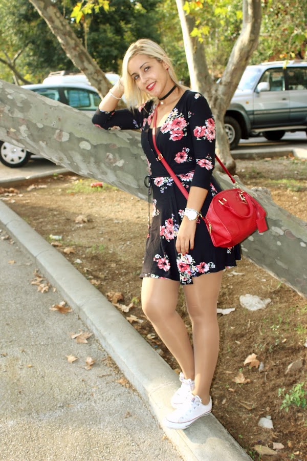 I love this trend of wearing sneakers, because they are perfect for casual chic outfits. In the outfit the day I wear a dancer dress with flowers and my Converse. As accessories I chose a red bag and my new chocker with a pearl that I love it.