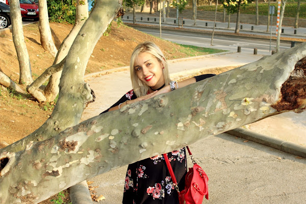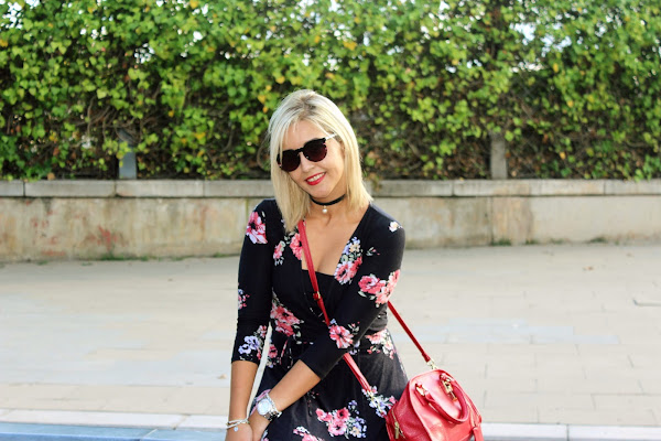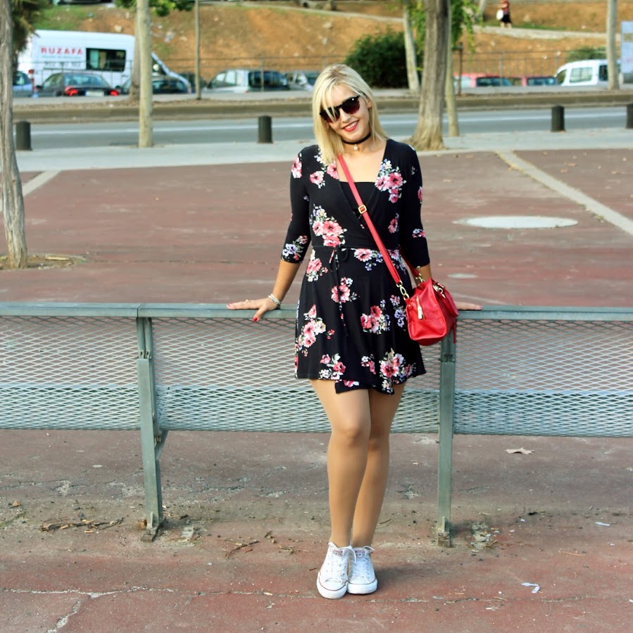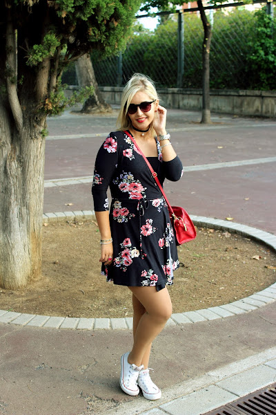 Y la verdad, es que me encanta esta moda de llevar zapatillas deportivas, ya que son perfectas para looks casual chic. En el look que os enseño hoy combiné mi vestido de bailarina con flores con mis Converse. Como accesorios elegí un bolso rojo y mi nuevo chocker con perla, que me encanta.