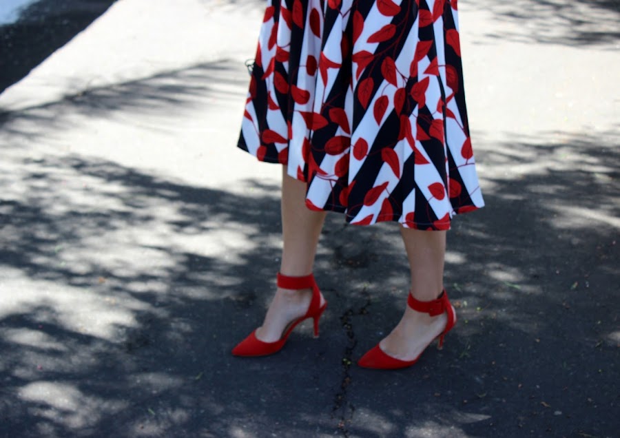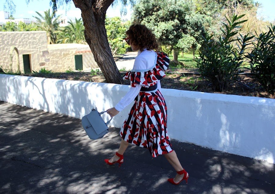 Este vestido lleva las ondas a lo largo del escote, los hombros y la manga, dando así más sensación de volumen y movimiento. La cinturilla negra no pertenece al vestido sino a la camisa. Saqué las tiras por un lado de la abotonadura y las até a modo de cinturón. Les dejo el enlace de la blusa para que vean otro look con ella.