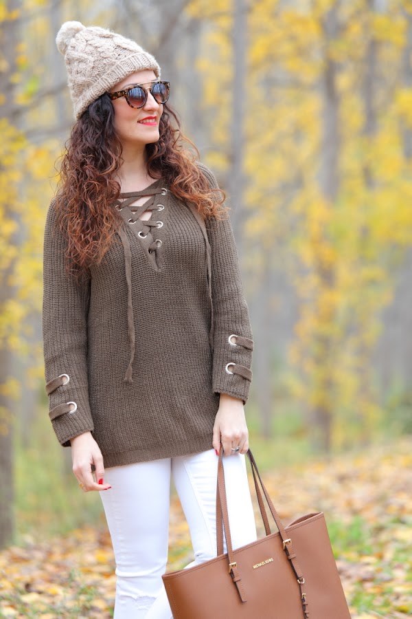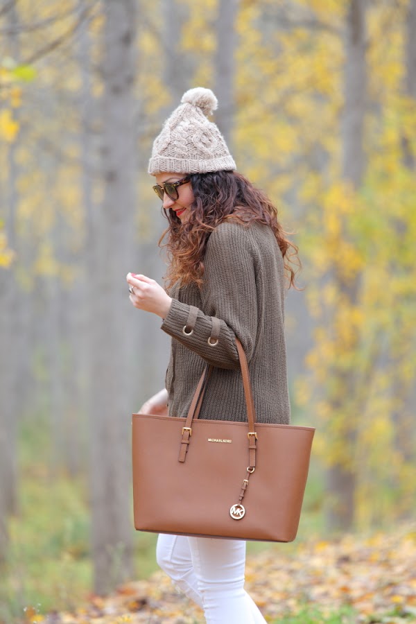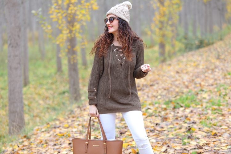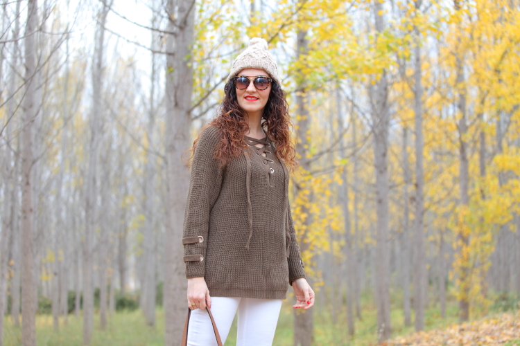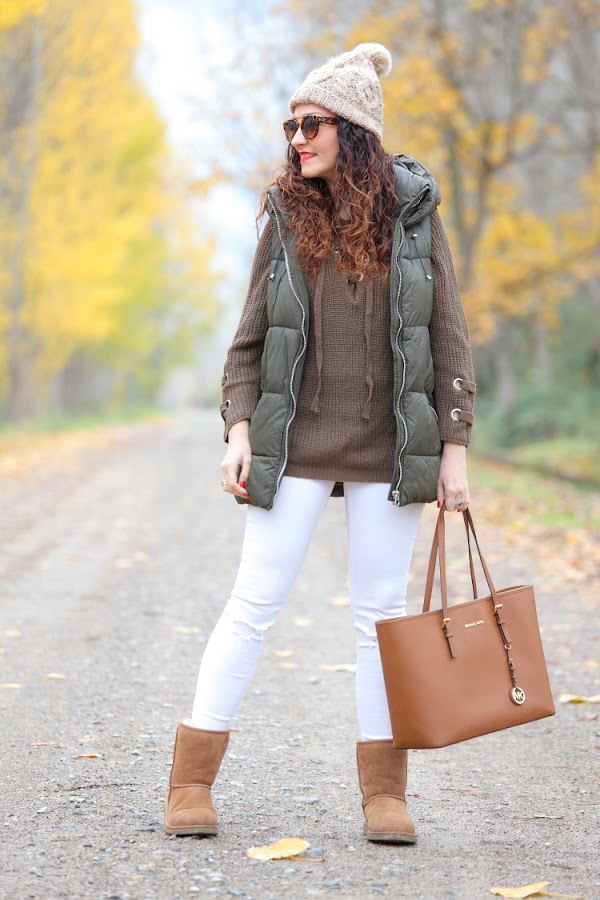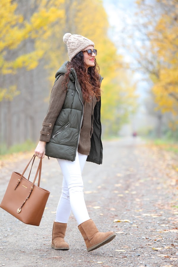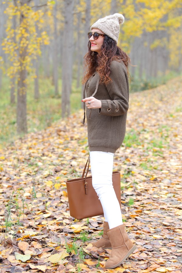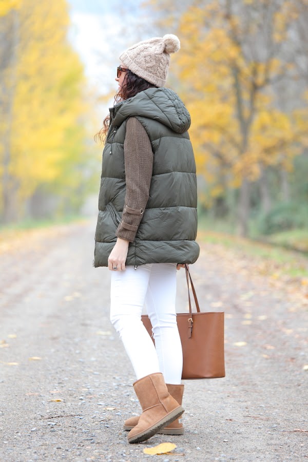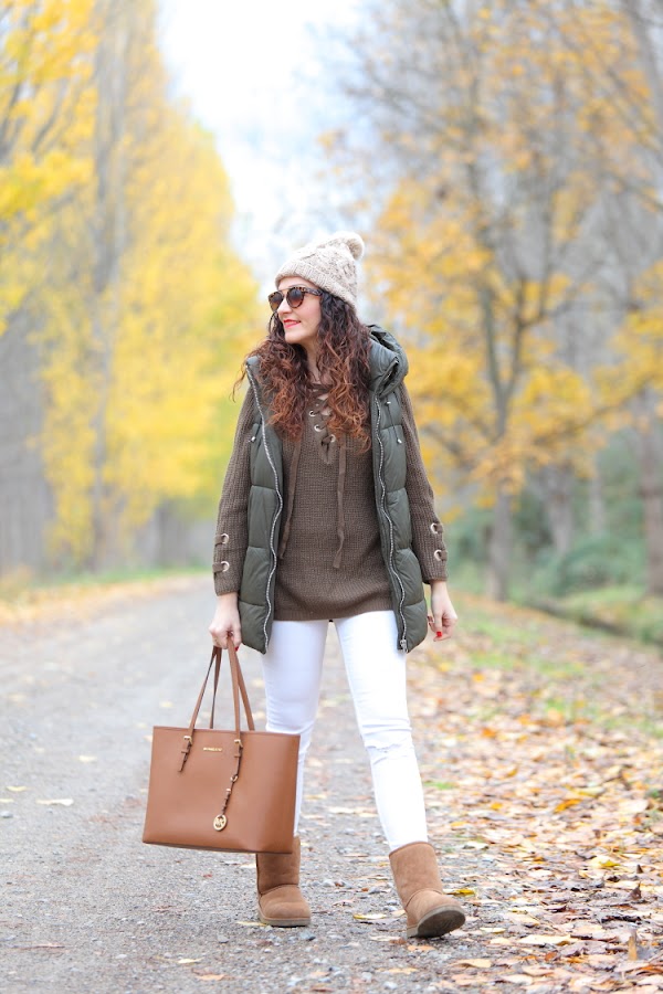 Aunque el otoño no es mi estación favorita, me encantan los colores que nos deja y disfruto paseando por lugares tan bonitos como en el que están hechas las fotos de hoy. Para esos paseos me decanto por estilismos cómodos y calentitos, que donde vivo hace mucho frío. Este look es uno de ellos, nada mejor que un jersey de punto con detalles muy de tendencia esta temporada como la lazada del cuello y las mangas. Lo llevo con un chaleco largo que abriga un montón y jeans blancos. Sí, yo soy de las que me gusta llevar pantalones blancos todo el año porque bien combinados los veo ideales hasta para el invierno. En los pies como no podía ser de otra manera, mis queridas UGG, sin duda el mejor calzado para el invierno.
