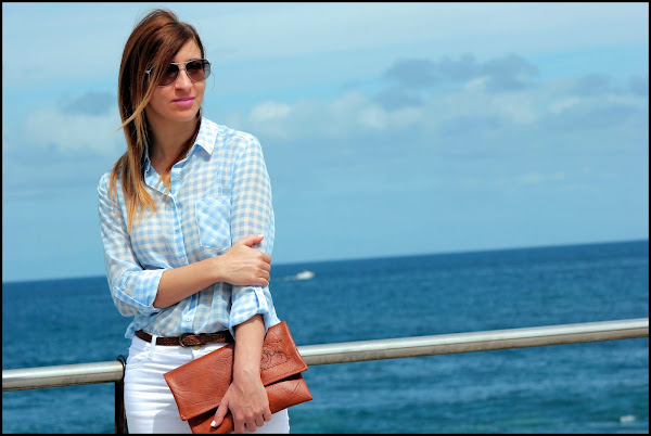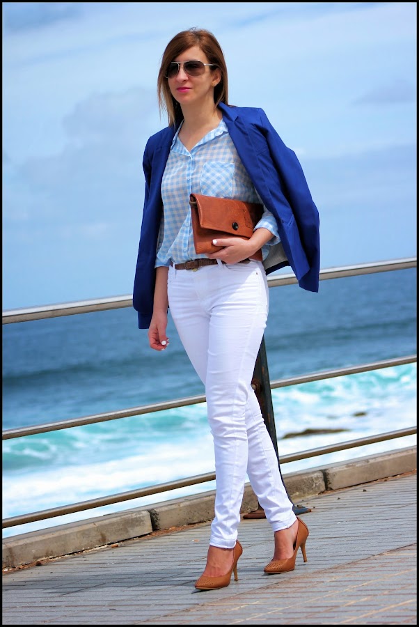 Una propuesta más para mi camisa de cuadros vichy en celeste o baby blue que tanto me gusta. En esta ocasión la he combinado con blanco, tonos marrones y la blazer azul pero tú puedes hacer lo mismo con prendas de estos colores que tengas en tu armario. Todas tenemos nuestras preferencias en cuanto a prendas y complementos, yo te doy ideas y ya tú las adaptas a tu estilo, por ejemplo si no te gusta ir con pantalón ajustado pues te pones una falda o pantalón más amplio. Calzado de tacón lo sustituyes por bailarinas o sandalias planas y en este caso que no llevo bisutería, tu puedes agregar la que te apetezca preferiblemente en los mismos tonos del look.