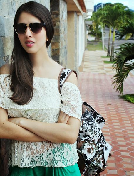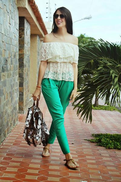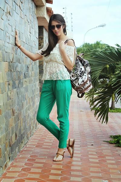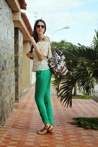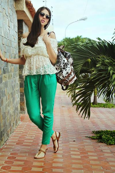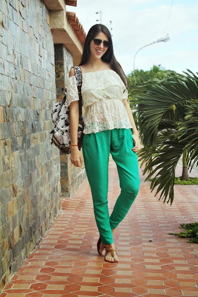 Las camisas con los hombros "al descubierto" son una de las tendencias que más ha sonado esta temporada, yo revisando entre esas cosas que tienes guardadas encontré esta hermosa camisa de encaje que fue regalo de mi abuela, es perfecta para climas cálidos por su frescura y comodidad; decidí usarla con estos pantalones en color verde de la marca nacional Le Duc, la hermosa mochila de Coco23 que por cierto me la enviaron la semana pasada y no he parado de usarla -ME ENCANTA- sandalias planas y lentes para el sol.