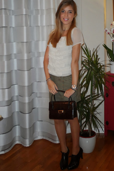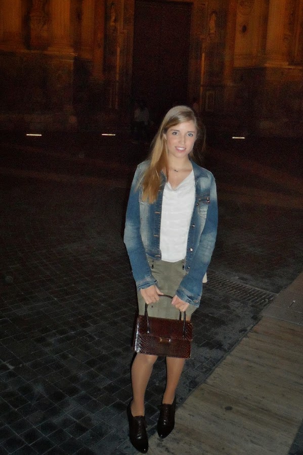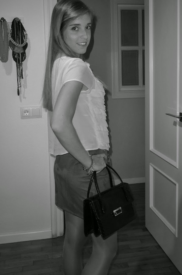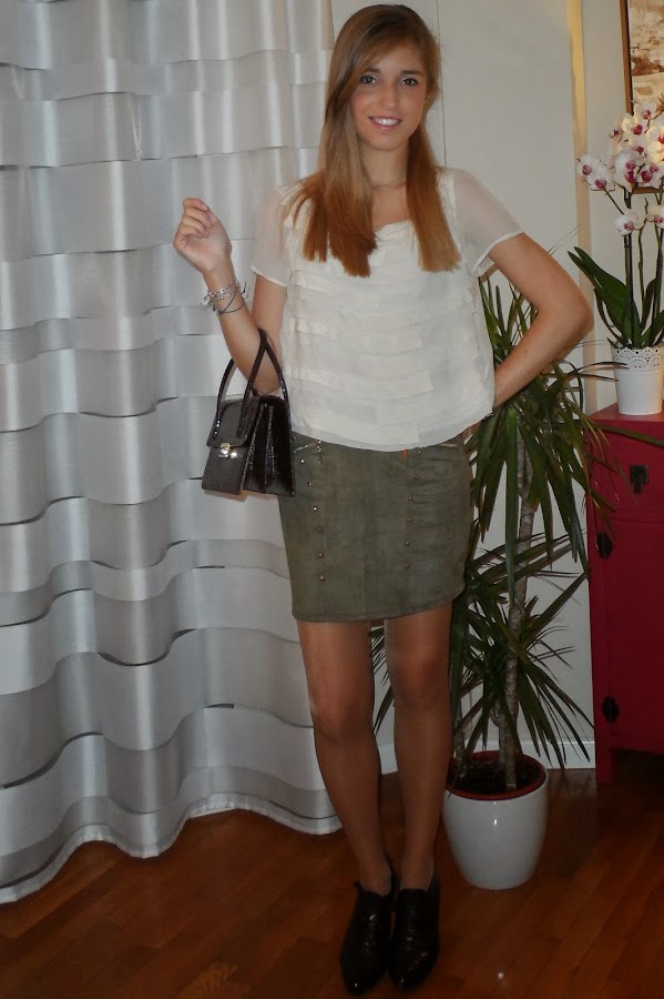 Hoy os traigo un look que me puse hace un par de sábados para salir a cenar. Digamos que la ocasión merecía arreglarse un poco más y elegí para ello: falda estrecha con tachuelas doradas y cuerpo de volantitos color crudo.Una cazadora vaquera y, con la temperatura que hizo, no se necesitaba nada más.