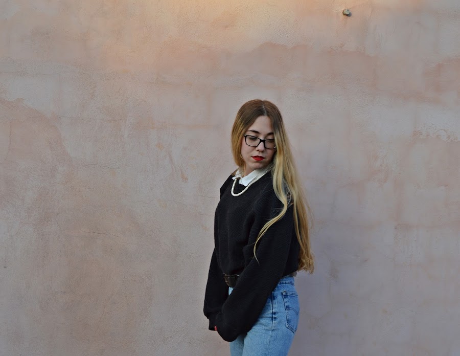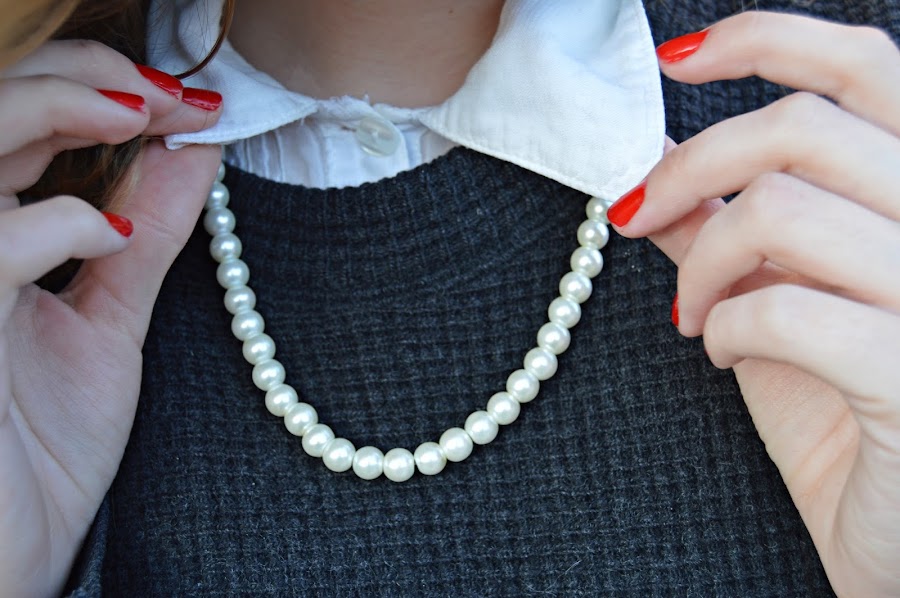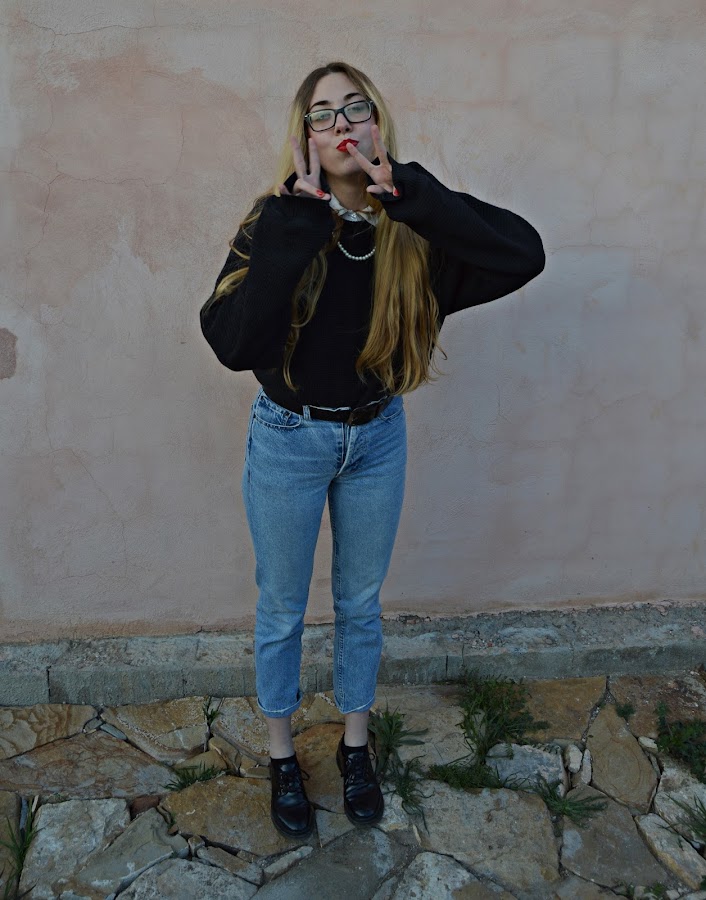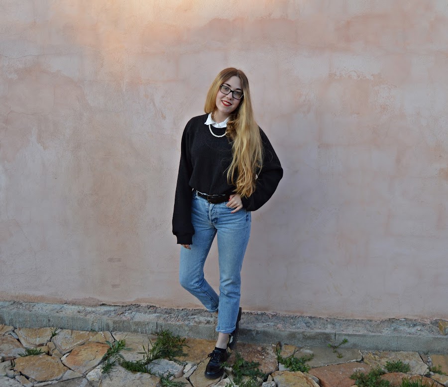 Para acompañar a los pantalones he elegido un jersey negro metido por dentro, junto con una camisa blanca que asoma el cuello, y los zapatos blucher. Como accesorio, simplemente llevo un collar de perlas y un cinturón de cuero. Como podéis ver todas las prendas evocan el estilo vintage.