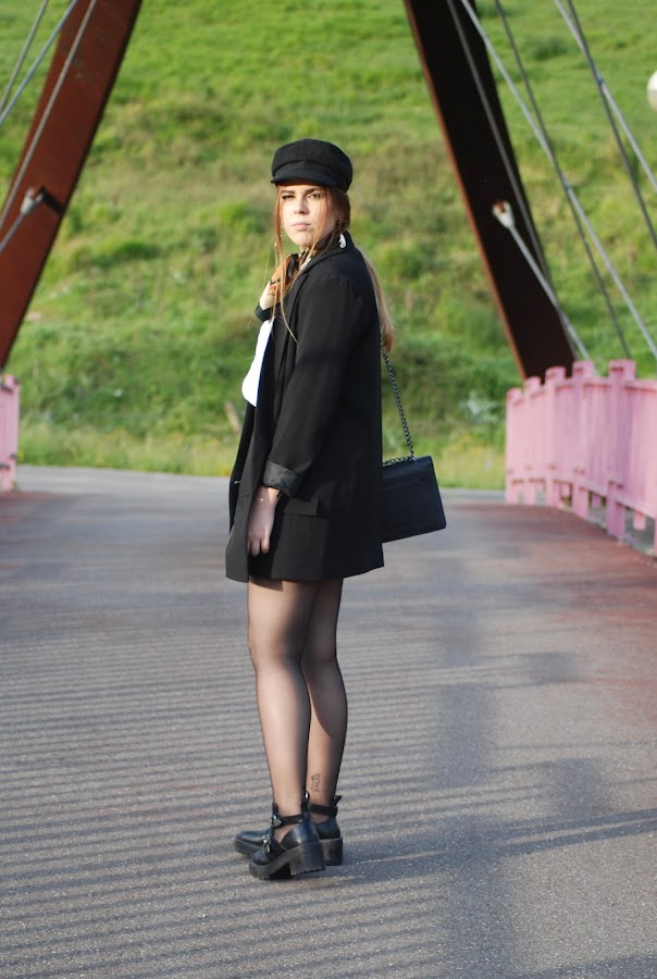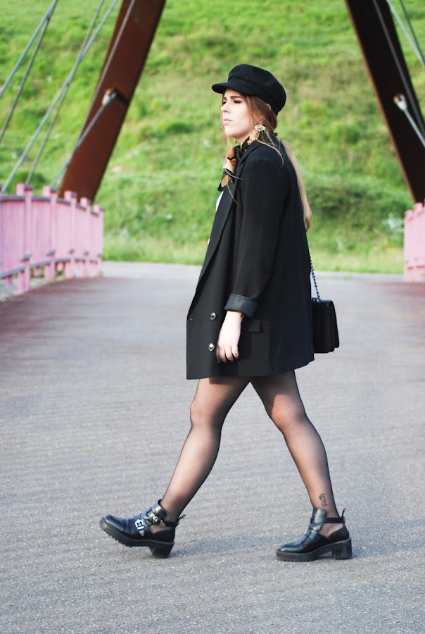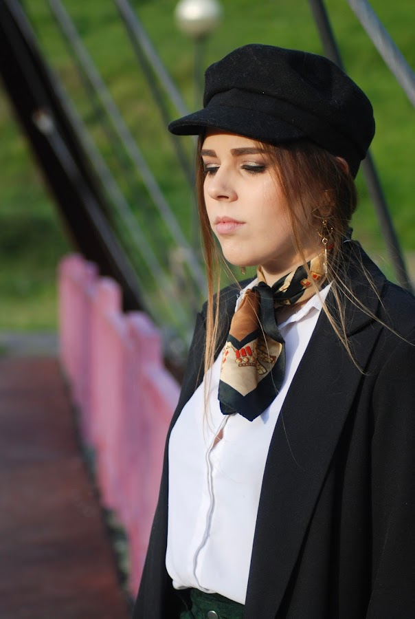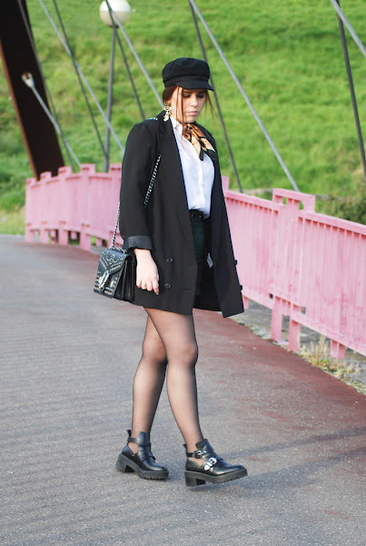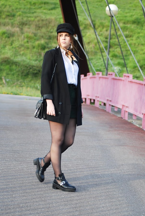 El look no tiene nada del otro mundo. Mi nuevo blazer favorito (soy adicta a los blazer, creo que ya lo sabéis) combinado con camisa blanca, mini falda verde, mis botines favoritos y como complementos gorra (necesito una nueva), el bolso inspiración Gucci que habéis visto ya mil veces, maxi pendientes y pañuelo al cuello.