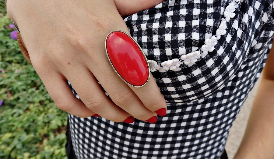 En este caso lo llevo con unos shorts negros de tiro alto, las sandalias de plataforma y como accesorios solo este anillo que le aporta color pero no le quita protagonismo a la pieza principal que en este caso es el bañador-top.