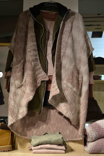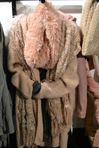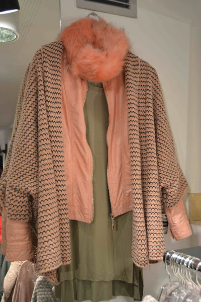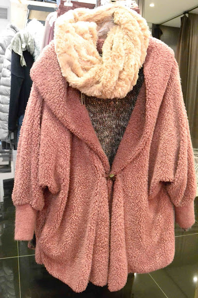Abrigo en color crudo con grandes botones, ponchos de borreguito con pompones y borlas que recuerdan a los ponchos Peruanos. Y chaquetas de estilo motero con cremalleras