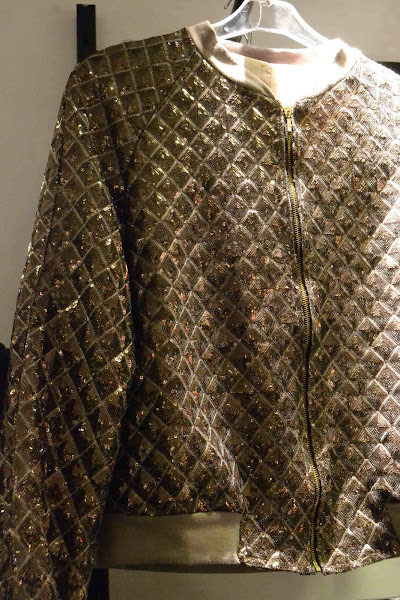 Esta chaqueta en color dorado con beige y detalles de pequeños rombos de suave tonalidad brillante, es perfecta para las noches de fiesta navideña con pantalón o falda en color marrón o negro