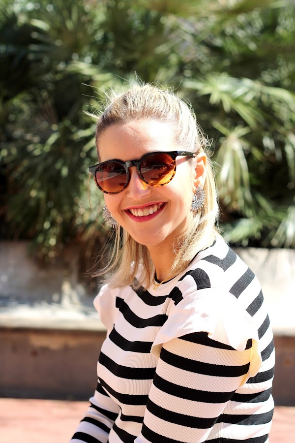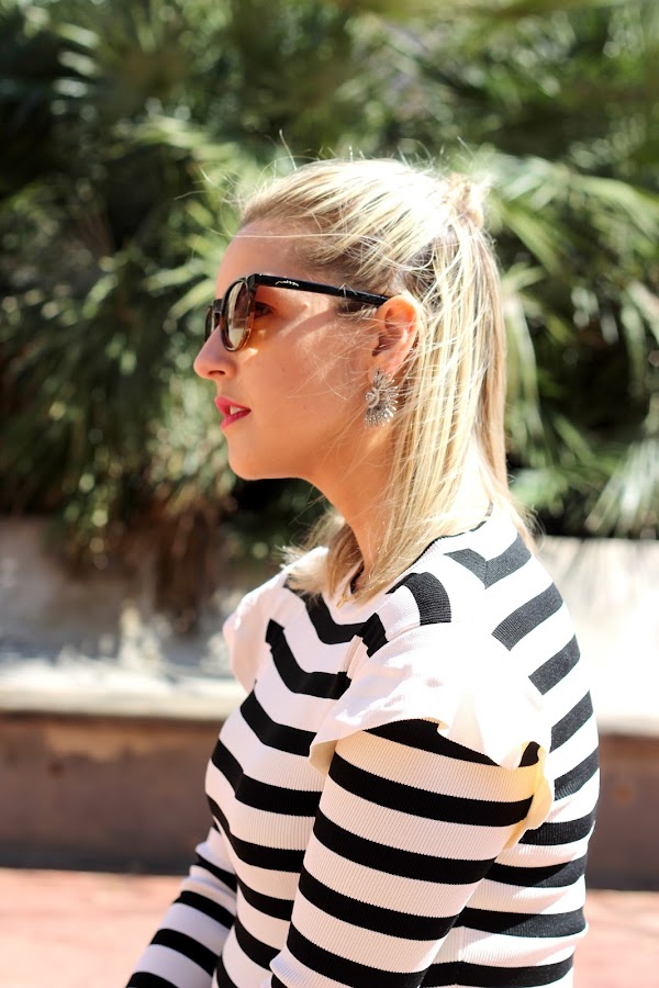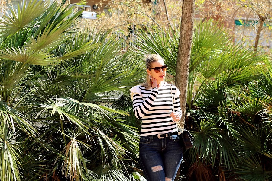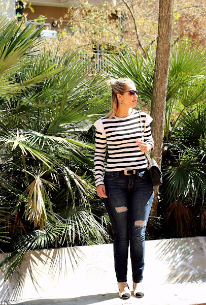 El look que os enseño hoy, es de ese tipo de looks que nunca pasan de moda y que me pondría cada día, ya que es cómodo y chic. Como ya sabéis me encantan las camisetas navy y cuando vi esta con el detalle del volante en los hombros, me conquistó. La combiné con unos jeans y mis nuevo zapatos beige y negro estilo Chanel. El resto de accesorios fueron mi bolso con parches y el cinturón estilo western que tanto se lleva este año. Un look casual chic perfecto para el fin de semana.