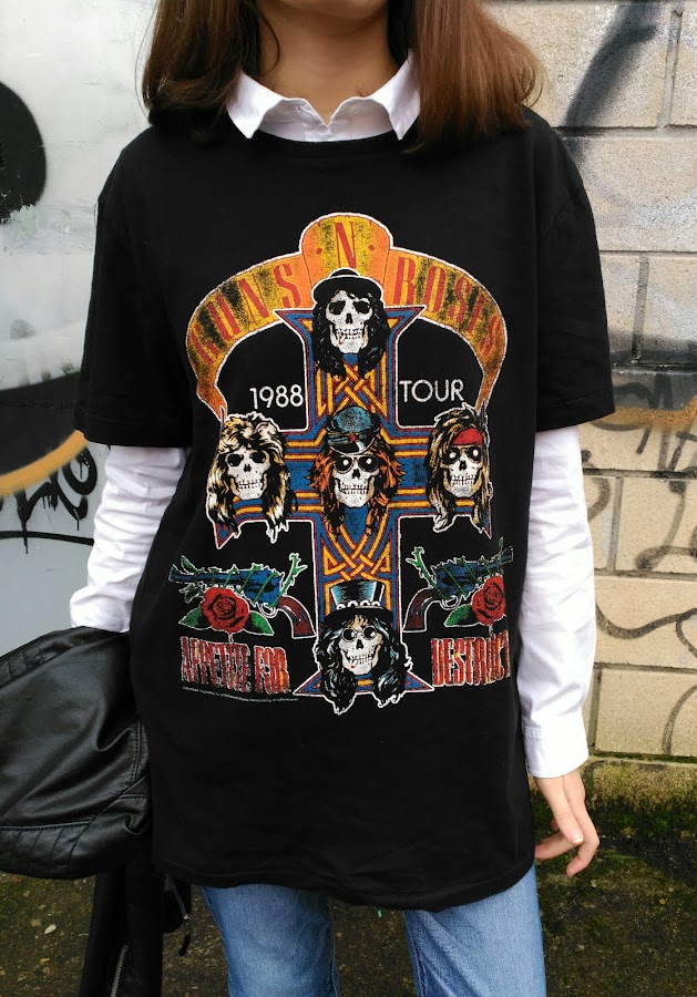 Para empezar la camiseta que llevo no es que sea muy formal, es más informal. Esta camiseta de los Guns N Roses la compré más o menos hace un par de días. Este tipo de camisetas se ven mucho en las tiendas últimamente. Los 80 arrasan en las tiendas. (Como dice mi madre "Todo vuelve"). Para hacerlo mas formal lo único que he hecho ha sido coger una camisa blanca básica y ponérmela por debajo.