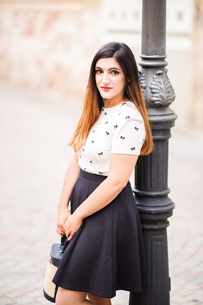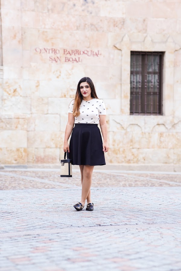 Como yo no soy de innovar con la mezcla de estampados, la combiné con una falda negra básica. También la he adquirido recientemente como fondo de armario, así que os adelanto que la veréis mucho a partir de ahora. Una falda skater negra vale para todo y nunca cansa.