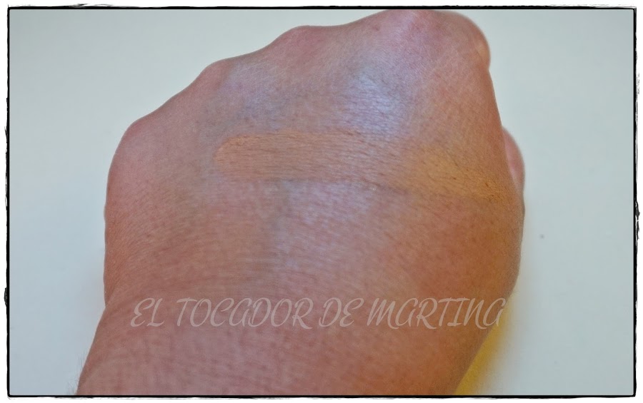 Lo que sí os puedo decir es que el producto, al igual que el anterior, es sorprendente por su precio. Es un bronceador que podríamos usar para contornear, porque por su textura en crema se trabaja muy bien sobre la piel, donde al poco se convierte en polvo, sin dejar película grasa alguna. También los estoy usando como bronceador propiamente dicho, lo aplico con brocha sintética (concrétamente uso mucho la multi task brush de Real Techniques) en frente, pómulos y barbilla, y el resultado me encanta. Aquí tenéis el swatch: